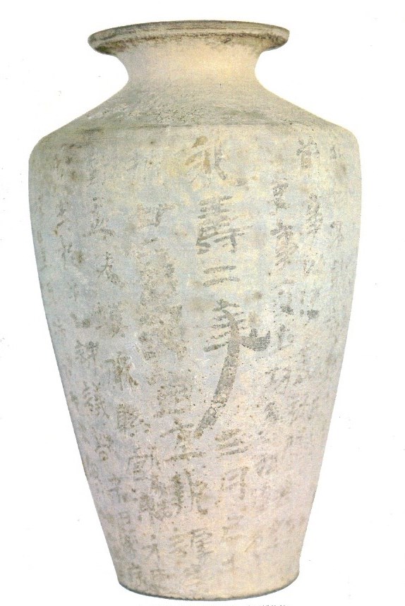 The ceramic urn was discovered at a Han tomb in Xian, Shaanxi Province (陝西省西安) in 1914. The inscription begins with ‘The third month of the second year of Yongshou (永壽二年三月)(156 CE). The text is believed to a report of the burial of the deceased to an underground (posthumous world) official. The urn is now kept at Taito City Calligraphy Museum (書道博物館) in Japan.