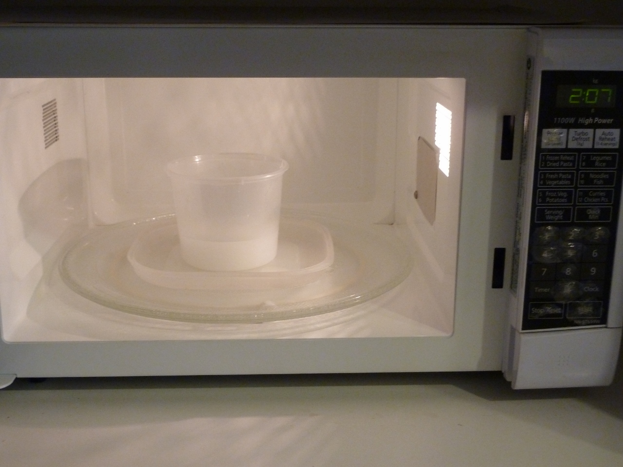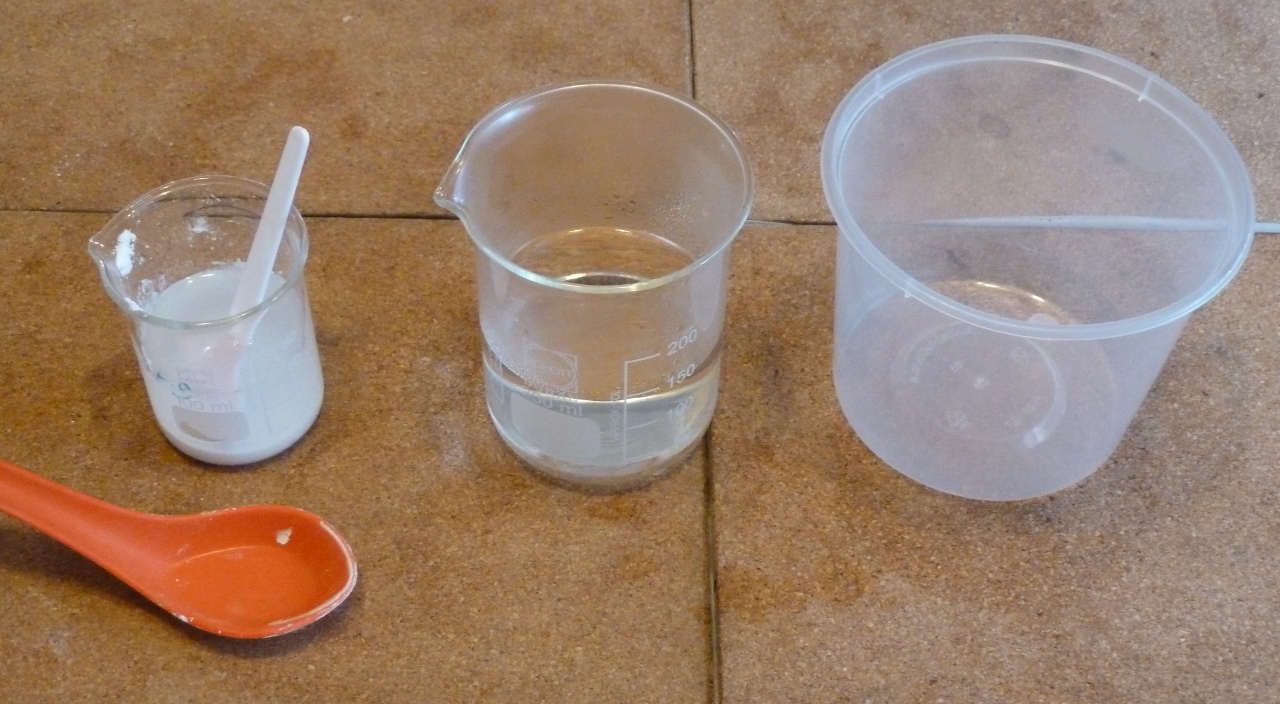 Dissolve 1 tablespoonful of wheat flour in about 50 mL of cold water in a small beaker. Pour the content into a microwave safe plastic container.
