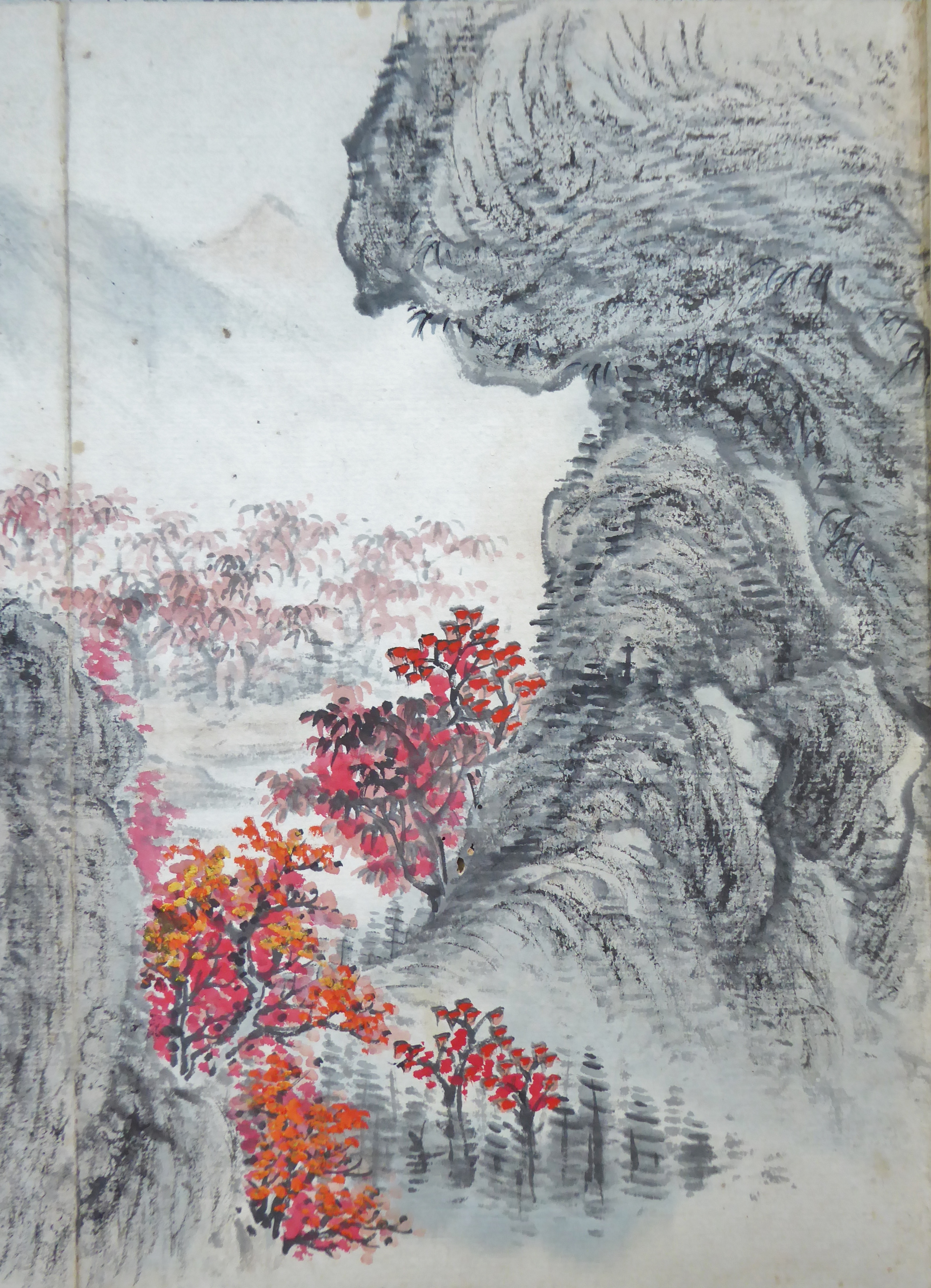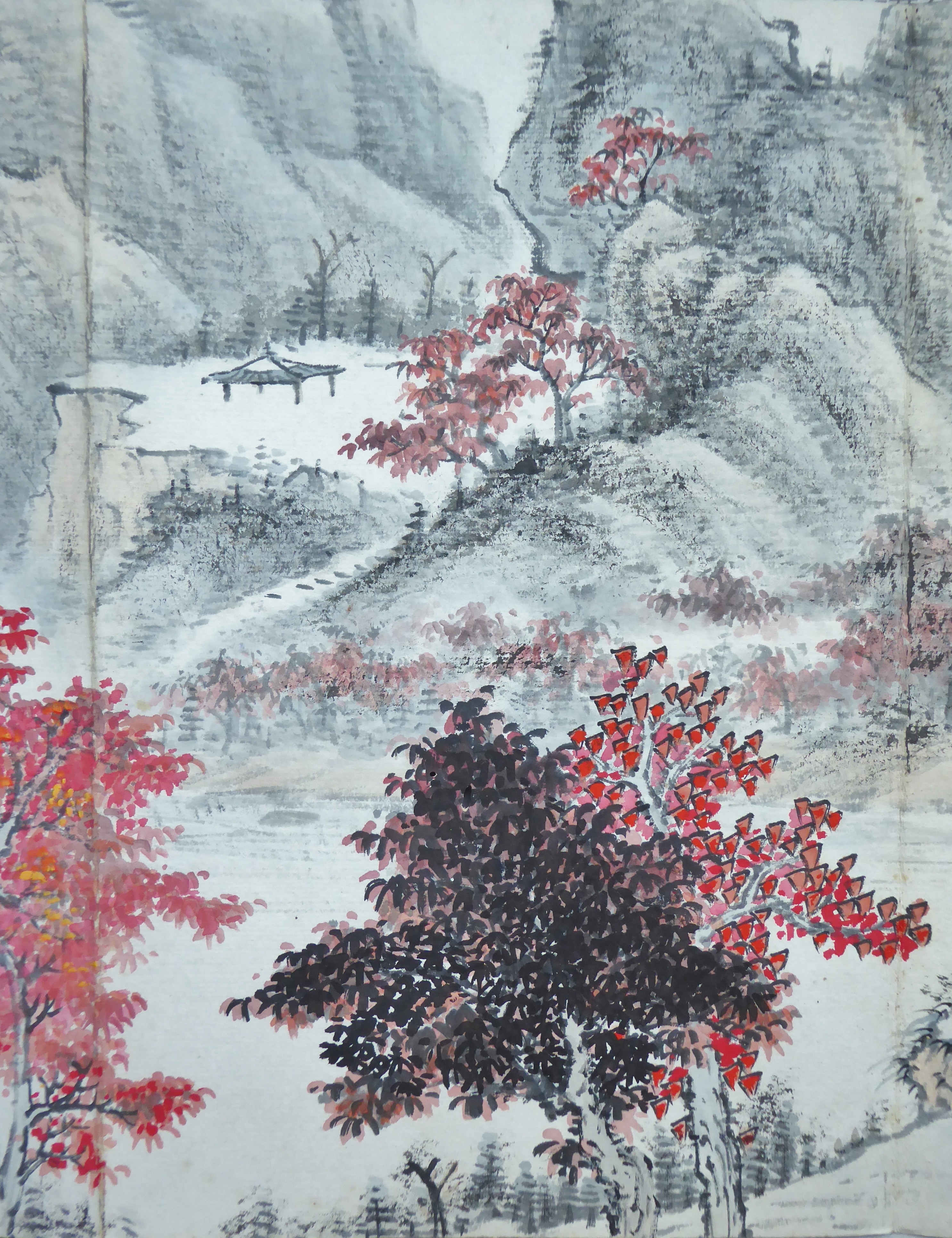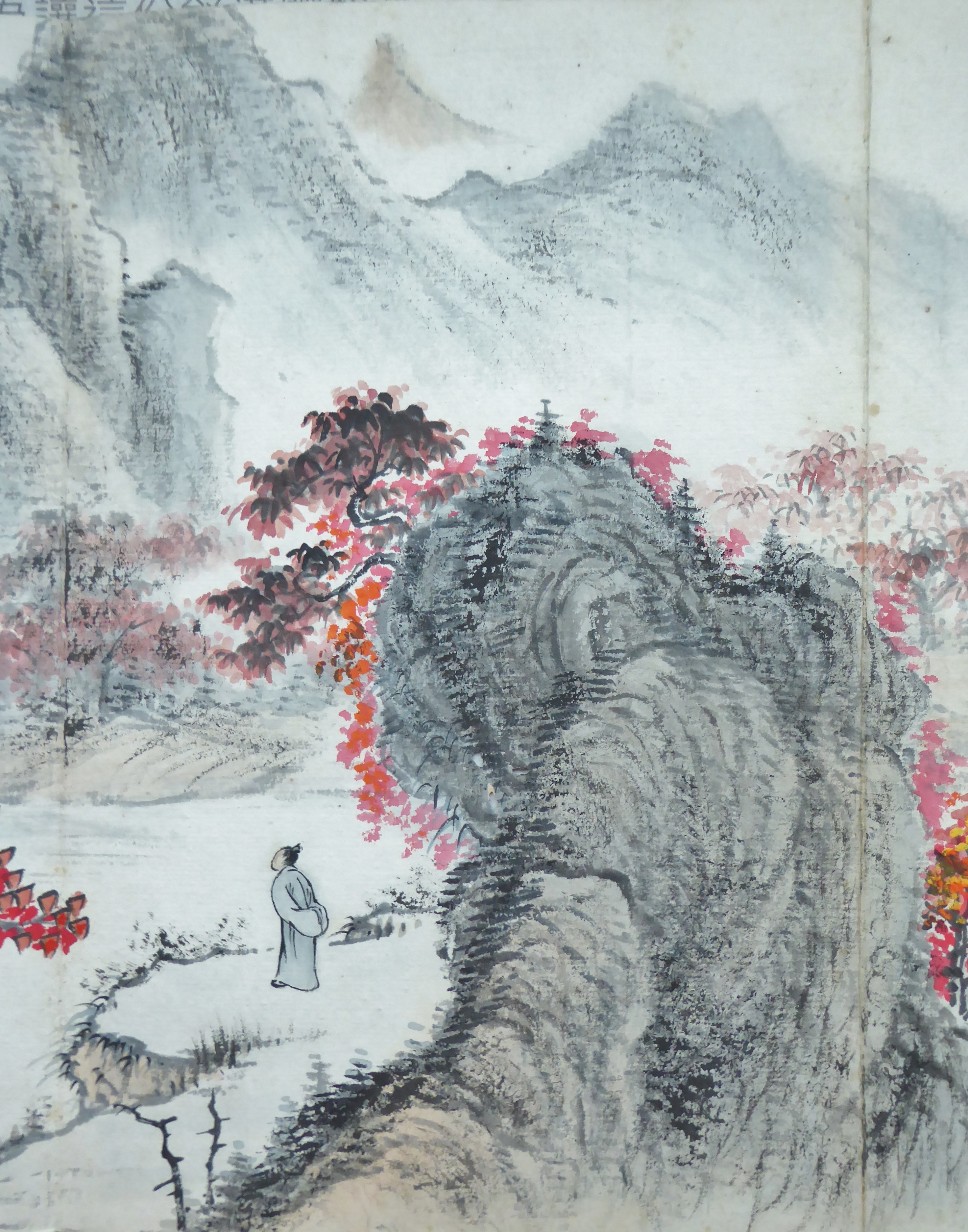 The ts’un (皴) he used to show the texture of the rocks is Ox Hair Ts’un (牛毛皴). He followed the style of Wang Meng 王蒙 (c. 1308 – 1385), one of the Four Great Masters of the Yuan Dynasty. Ox Hair Ts’un which intertwines among the rocks matches well with the red maple leaves.
