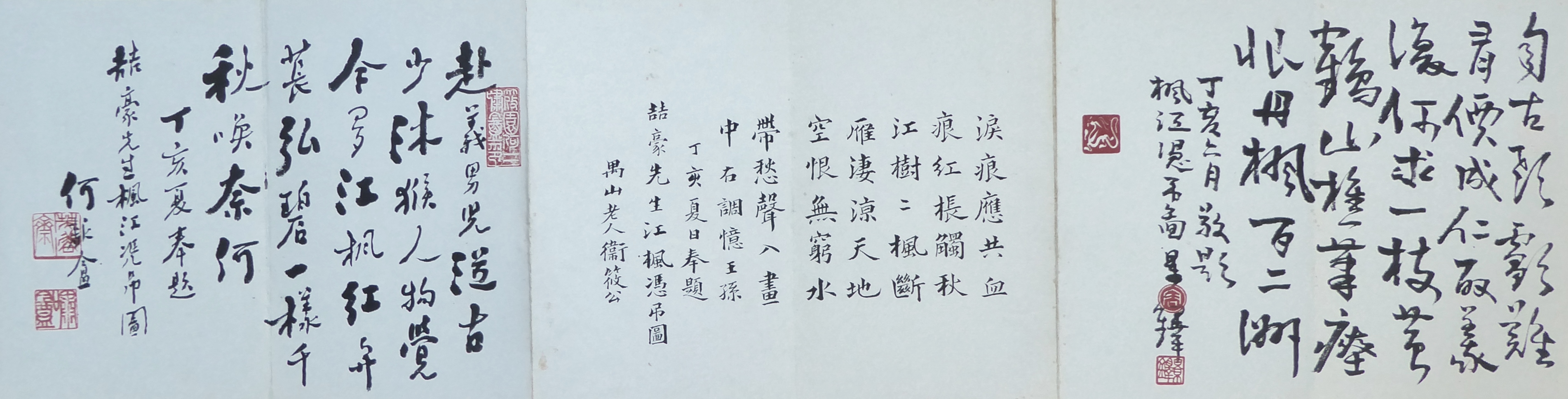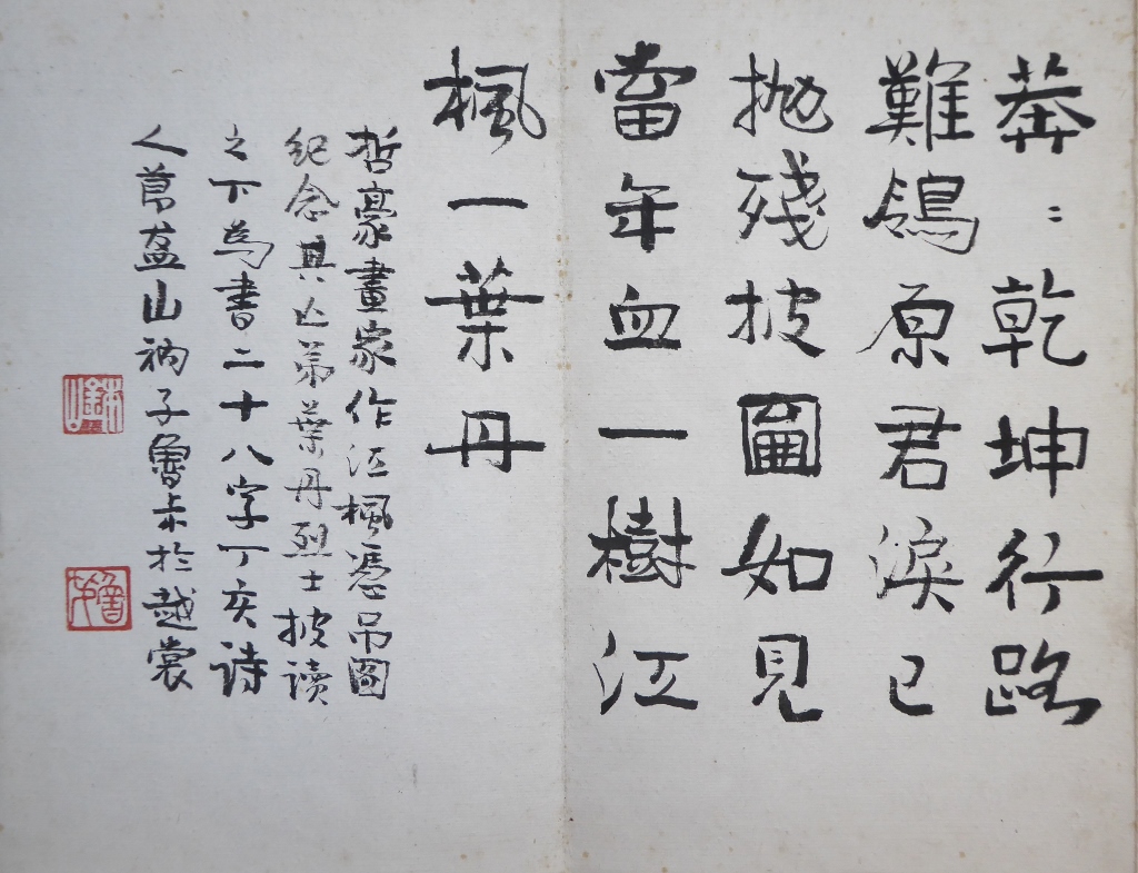 Mr Ip put strong red colour onto the maple leaves to express his deep emotions. The red maple leaves, which occupied such a prominent place in the scroll, may perhaps meant to represent the blood shed by Ip Dan, a victim and martyr of the war.