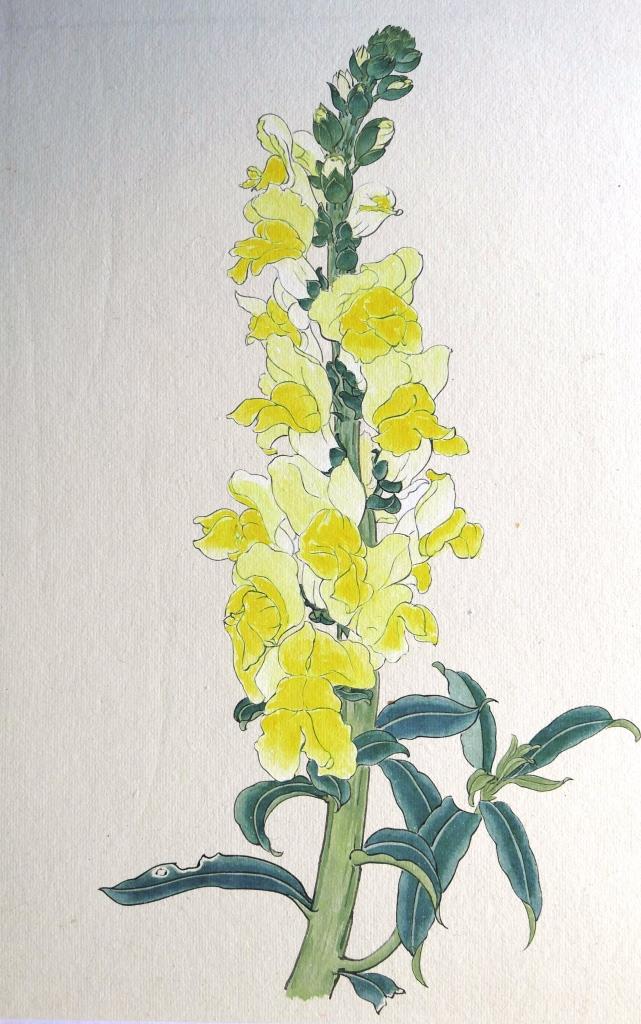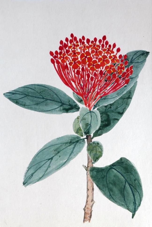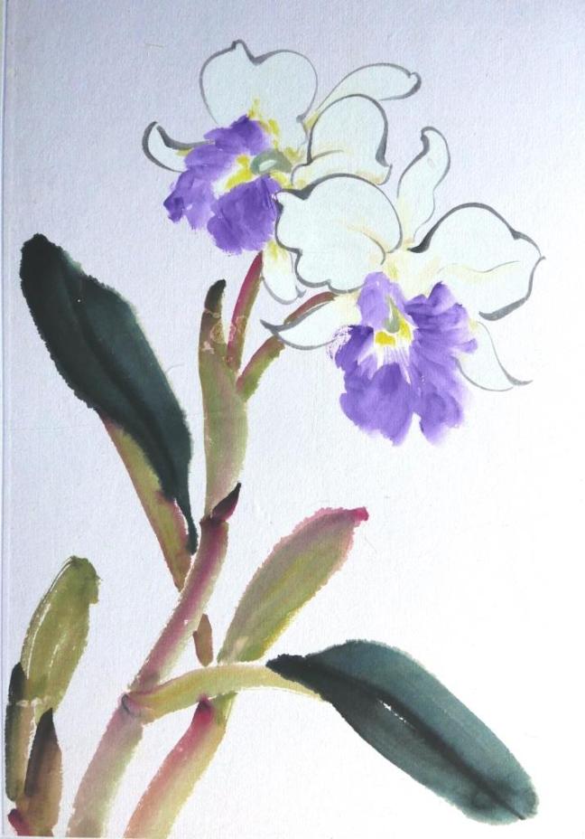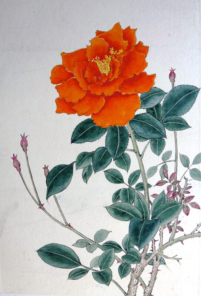 In the painting above, the tip of the brush was charged with two or more colours. The stem was painted in a single stroke but shades of more than two colours can be seen. This demonstrates a very high level of skills.