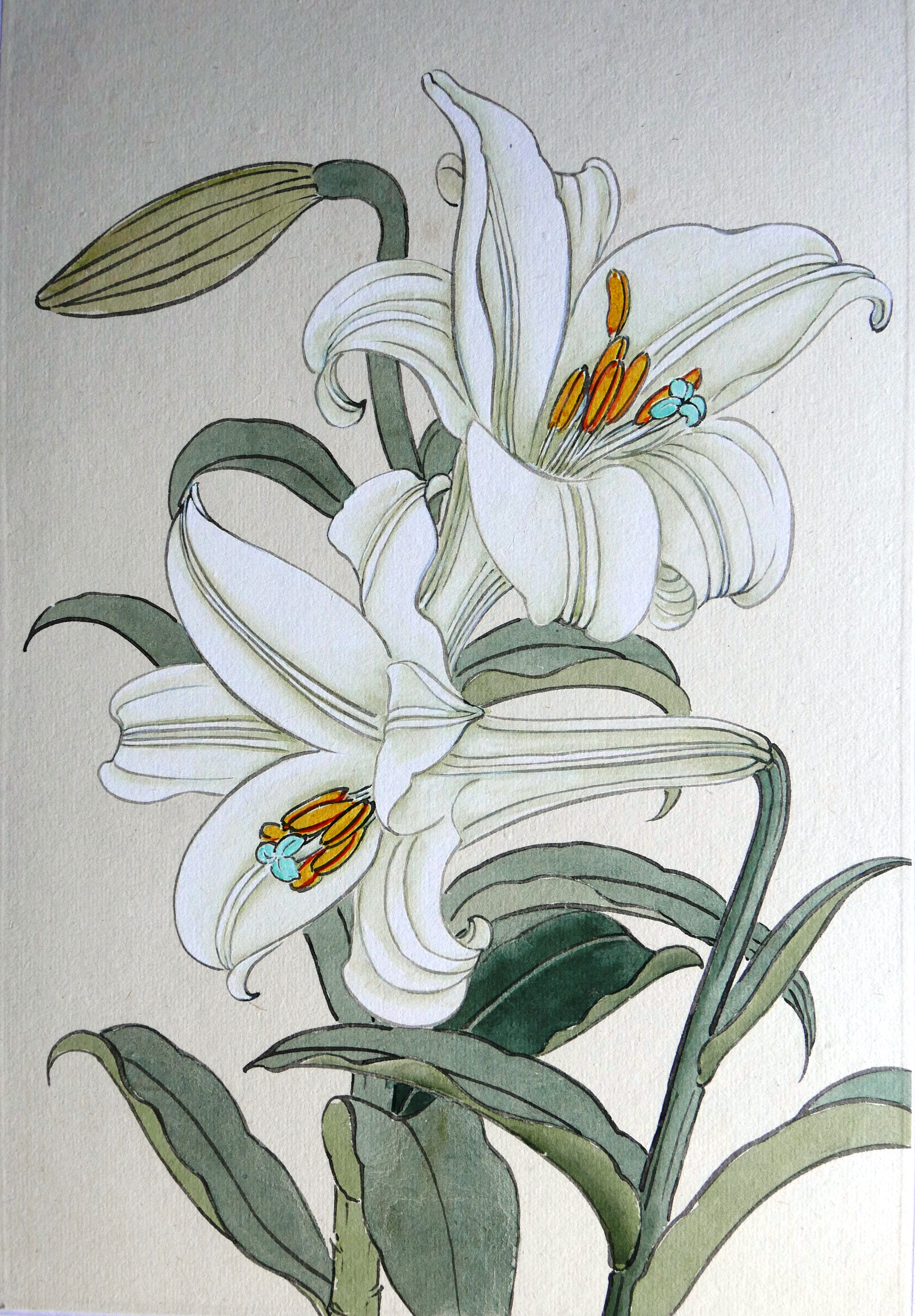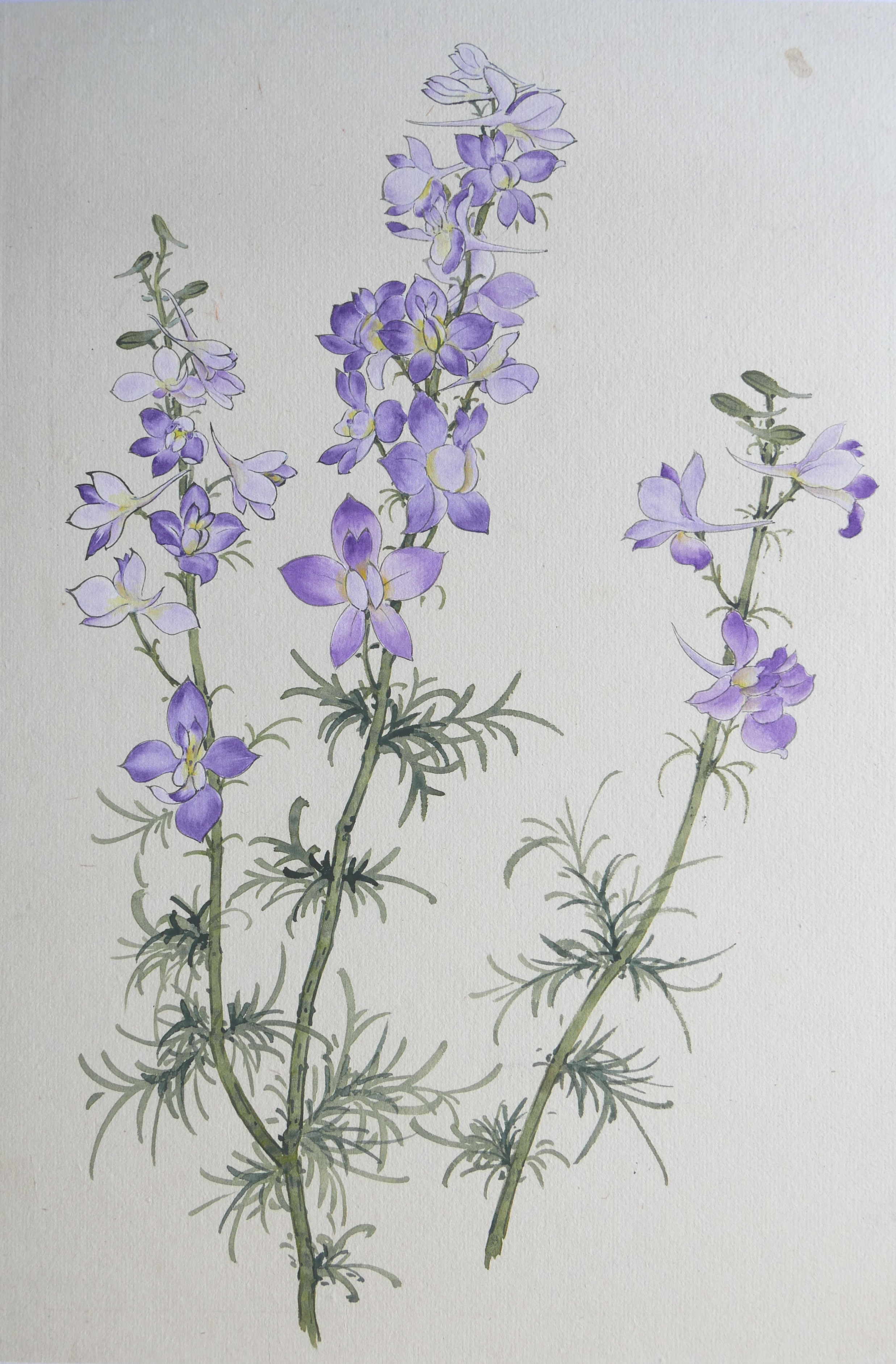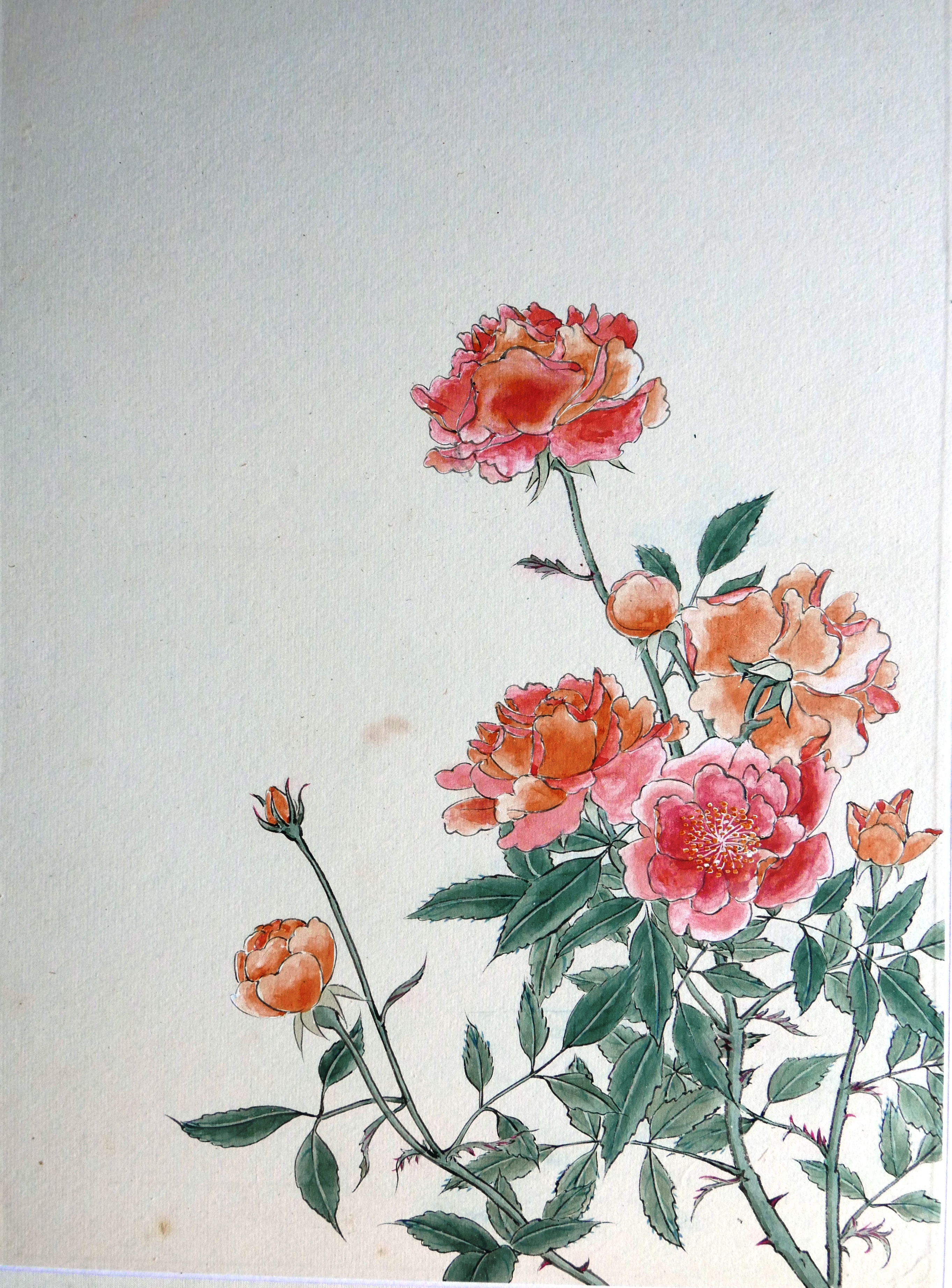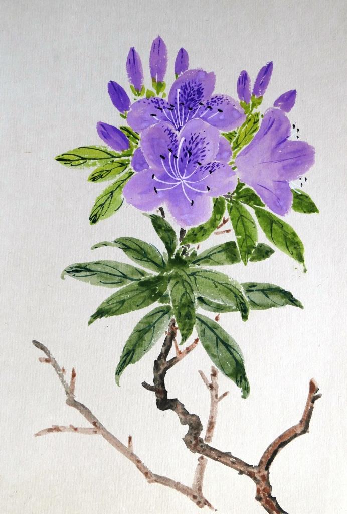 In the painting above, the tip of the brush was charged with two or more colours. The stem was painted in a single stroke but shades of more than two colours can be seen. This demonstrates a very high level of skills.
