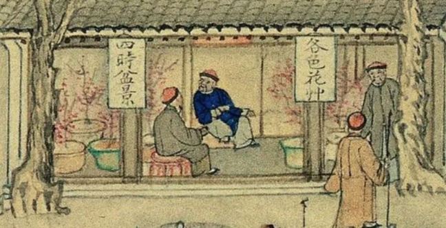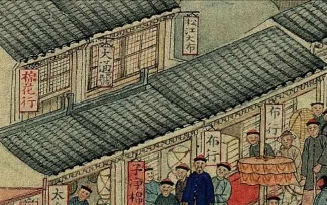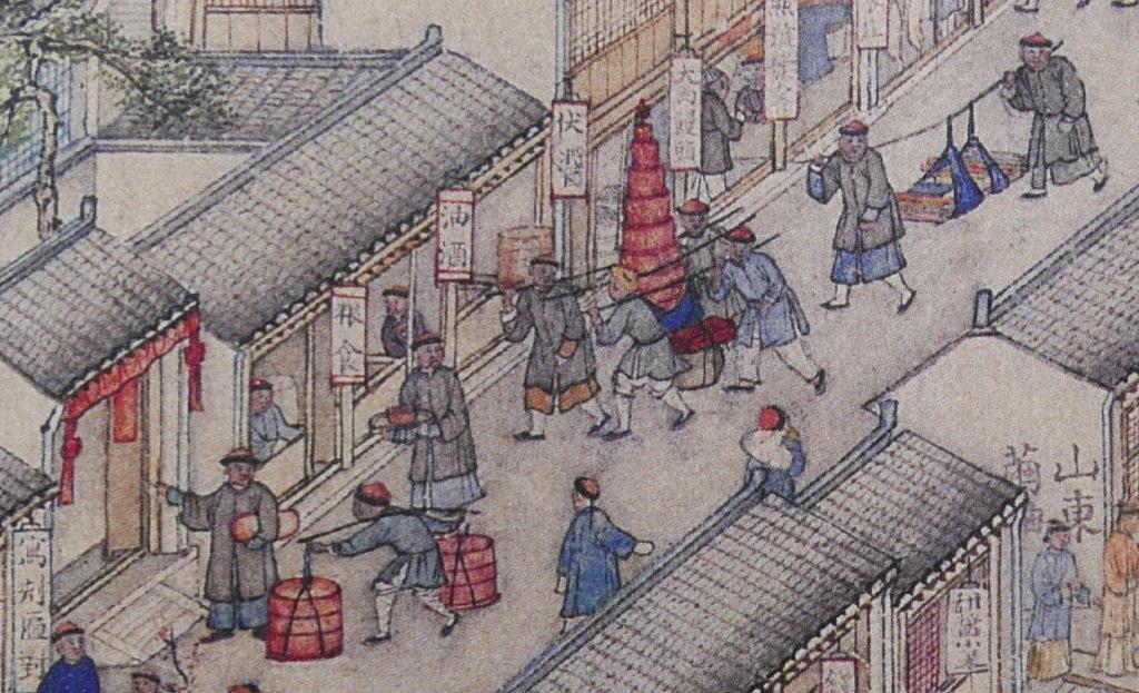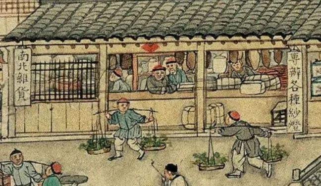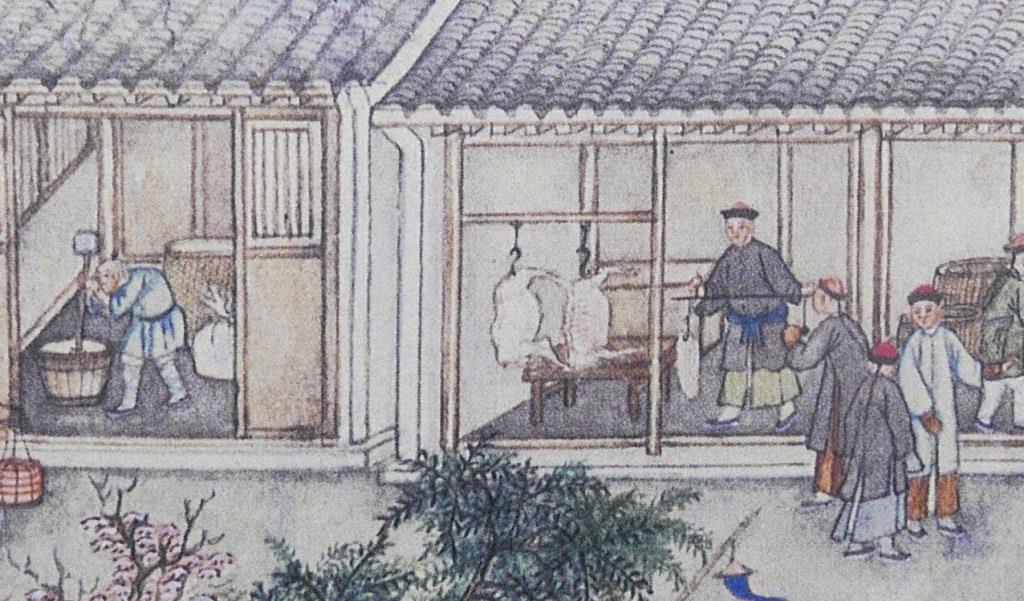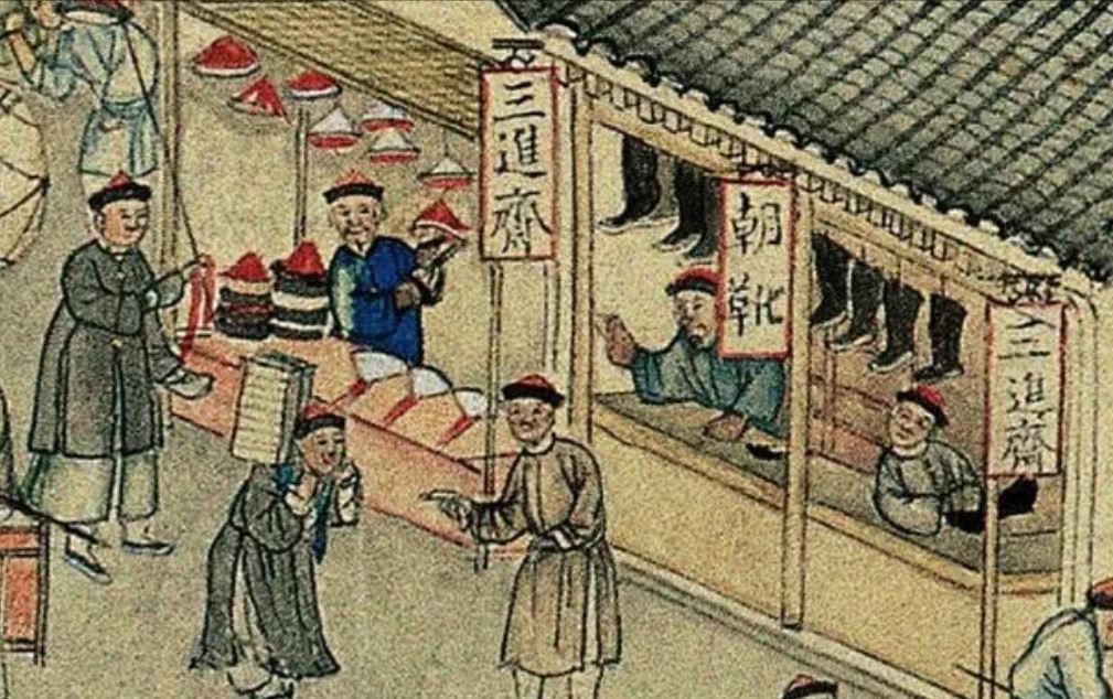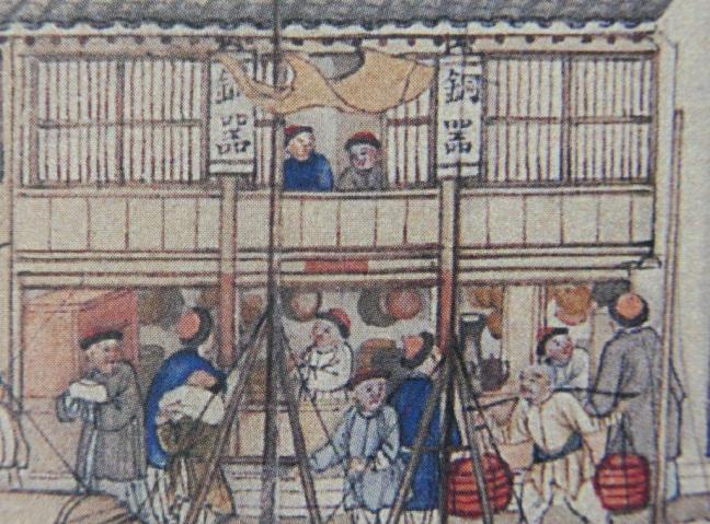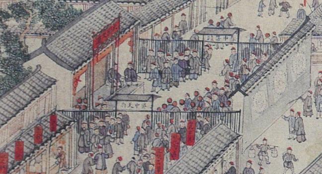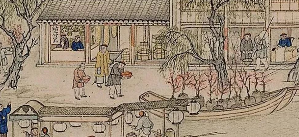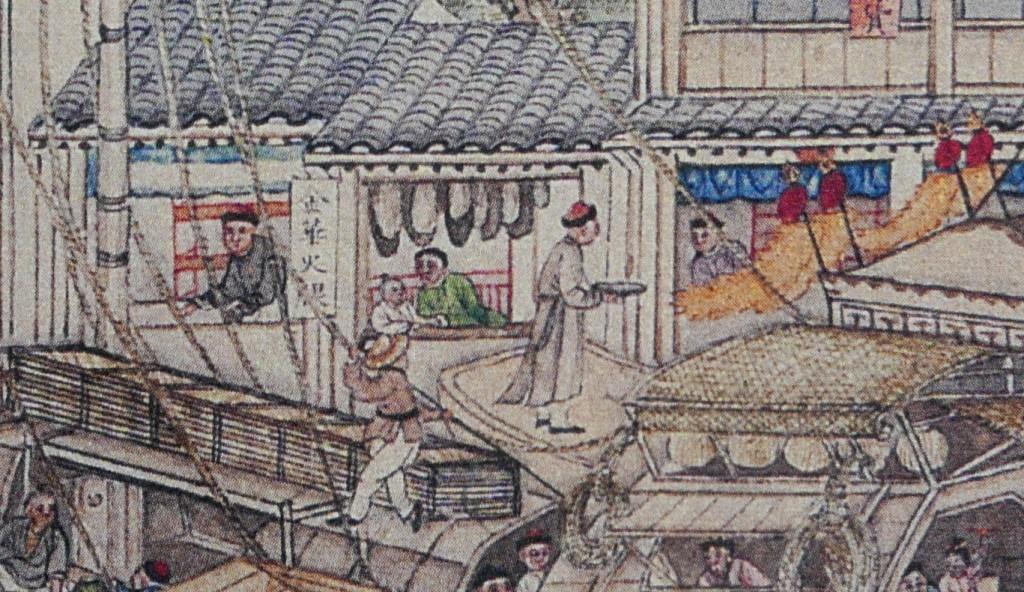 Fabrics (布) ShopsCotton (棉花) shops, fabrics (布) ShopsBoot (靴) shopHat shop, boot (靴) shopContainer (盤盒) shop, bamboo matt (𥱊) shopBamboo ware (竹器) shop, pot plant shop(From the left) iron and copper ware (鐵銅器) shop, food (粮食) shop, rice (米) store, garment (成衣) shopJinhua Ham (金華火腿) shop. Jinhua ham is a dry-cured ham named after the city Jinhua, in eastern China. This delicacy is still popular nowadays.Copper ware (銅器) shop(From the top left) a fine art gallery with paintings and a herbal medicine (藥行) shop, where the person facing the window may be the doctor (醫師) and the other person may be the patient. At the ground floor is a money exchange shop (兌換錢庄).Shop selling goods from other provinces (各省雜貨)(From the left) wine (酒) shop, cake (荳餅) shop, oil and wine (油酒) store, food store (粮食)Cake (糕餅) shopPot plant, bonsai (盆景) and flower (花草) shopGoods from northern and southern provinces (南北雜貨), lamp (紗燈) shopPainting dealerBookshop for contemporary and antique (古今書籍) booksGold, silver and jewellery (金銀首飾) shop, paper (紙張) shopFine fan (雅扇) shop(From the left) food store (粮食油酒荳餅老行), tobacco shop (煙行), hotel (客寓), firewood and coal (柴炭) shopMusical instrument (pipa 琵琶 and other plucked instruments 絃子) shop