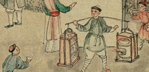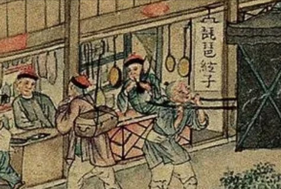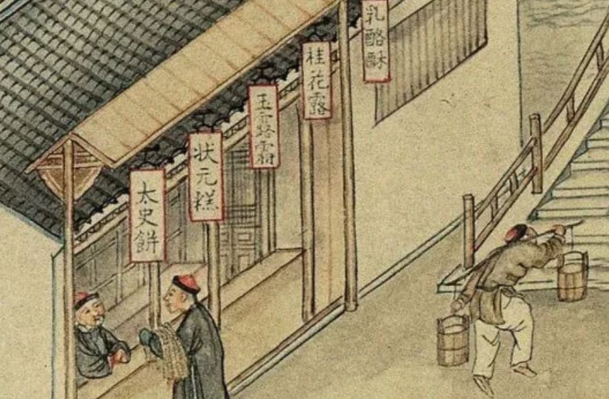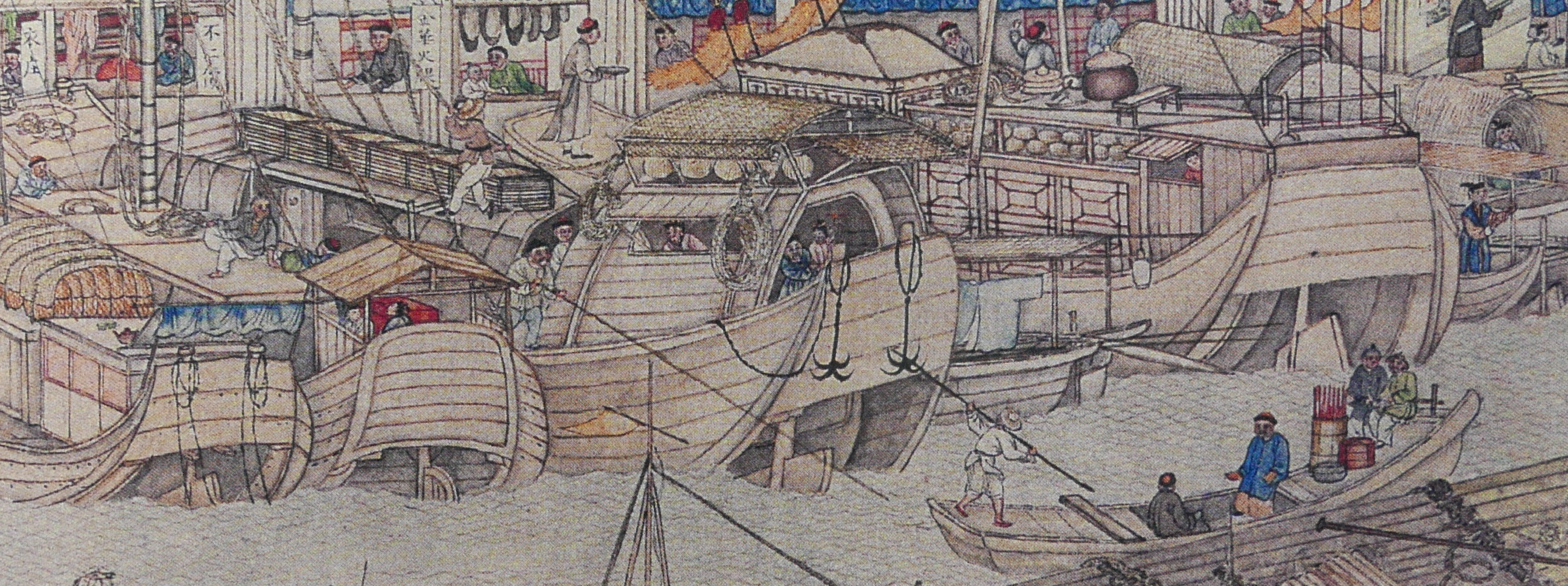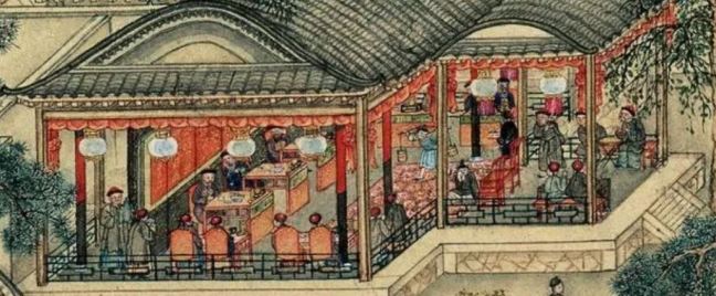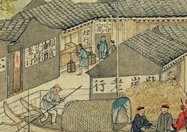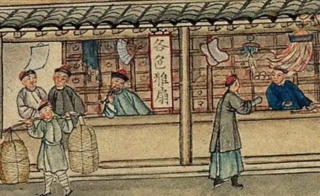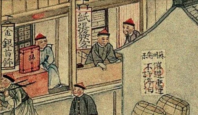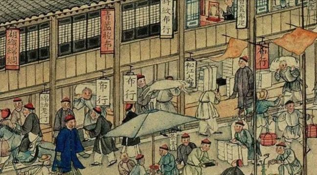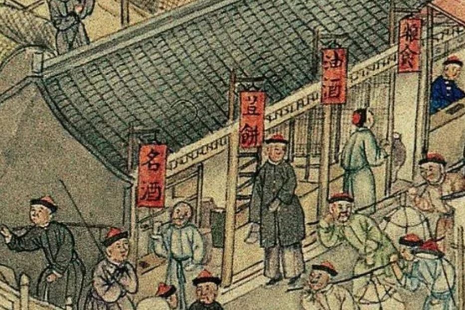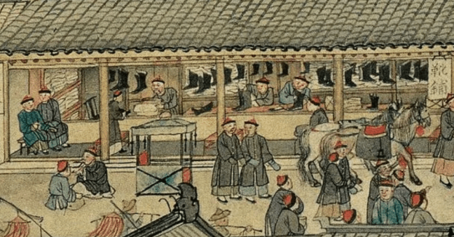 Fabrics (布) ShopsCotton (棉花) shops, fabrics (布) ShopsBoot (靴) shopHat shop, boot (靴) shopContainer (盤盒) shop, bamboo matt (𥱊) shopBamboo ware (竹器) shop, pot plant shop(From the left) iron and copper ware (鐵銅器) shop, food (粮食) shop, rice (米) store, garment (成衣) shopJinhua Ham (金華火腿) shop. Jinhua ham is a dry-cured ham named after the city Jinhua, in eastern China. This delicacy is still popular nowadays.Copper ware (銅器) shop(From the top left) a fine art gallery with paintings and a herbal medicine (藥行) shop, where the person facing the window may be the doctor (醫師) and the other person may be the patient. At the ground floor is a money exchange shop (兌換錢庄).Shop selling goods from other provinces (各省雜貨)(From the left) wine (酒) shop, cake (荳餅) shop, oil and wine (油酒) store, food store (粮食)Cake (糕餅) shopPot plant, bonsai (盆景) and flower (花草) shopGoods from northern and southern provinces (南北雜貨), lamp (紗燈) shopPainting dealerBookshop for contemporary and antique (古今書籍) booksGold, silver and jewellery (金銀首飾) shop, paper (紙張) shopFine fan (雅扇) shop(From the left) food store (粮食油酒荳餅老行), tobacco shop (煙行), hotel (客寓), firewood and coal (柴炭) shopMusical instrument (pipa 琵琶 and other plucked instruments 絃子) shop