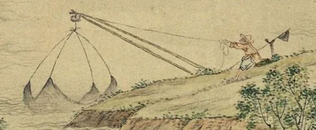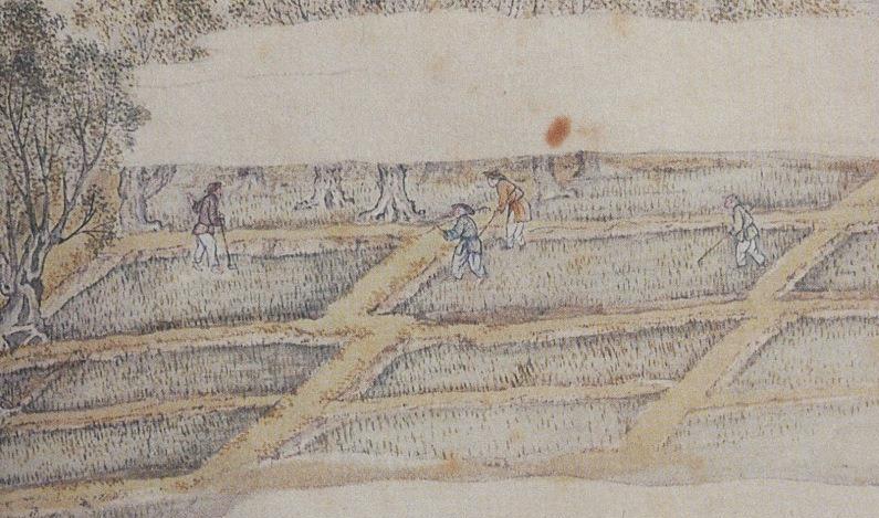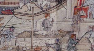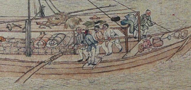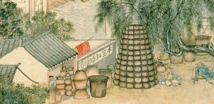 A pottery making warehouse (缸罈窑) and shop (發客)Two people are drying newly-made tiles on the beach.Two ironmongers are busy beating heated metals. They are making farming ploughs (鐵造田器).