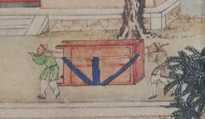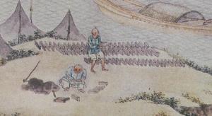 Several people casually dressed with peasants’ hats are bowing to a high ranking official on a sedan chair. Some officers are about to distribute things to them. The green rim banner and the blue umbrella near the sedan chair indicate the high ranking of the official.