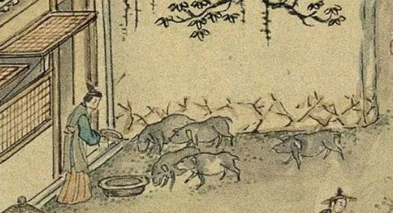 A maid looking after pigs