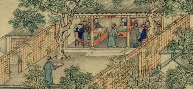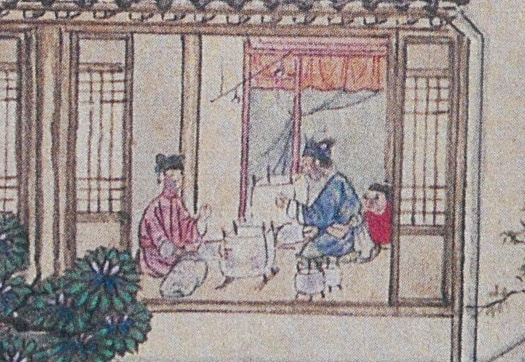 A play or an opera is on the carpet in the middle of a hall. The occasion may be a birthday party (壽讌) for a wealthy or prestigious elderly person. One actor is holding two buckets and an actress sitting on the carpet. The people on the right hand side may be musicians accompanying the opera.