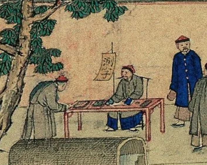 Under his booth, a fortune teller (神相) (on the right) is talking to his customer with other people watching behind. The fortune teller can make a prediction based on reading the customer’s face and birth details.A fortune teller (測字) seated at the table asks his customer to find a character (word). From the character the fortune teller can foretell the man’s future.