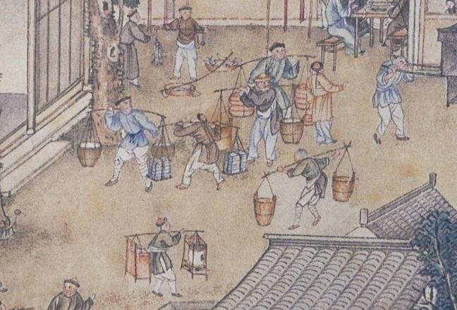 Porters use shoulder poles to carry evenly distributed loads on both sides of their shoulders.Porters carrying parcels wrapped in red with shoulder yokes to a house decorated with red ribbons on the doorway. The red wrappings on the parcels depicts gifts for special occasions probably birthday gifts to an elderly person. The following image shows the inside of the house.