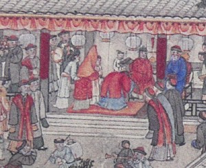The bride has a reddish orange veil and the bridegroom is kneeling down with his head lowered to pay respect (kou tou 叩頭) to his be-seated Mother and Father in red and blue dress respectively.