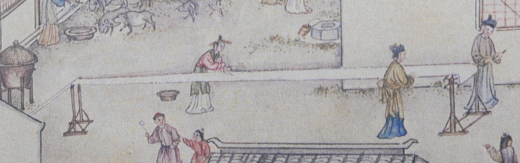 Silk fabrics making workshopsTwo people are winding silk threads onto frames of 4 posts.A woman is preparing newly woven-silk.Workshop for dyeing fabrics (染坊) into various colours