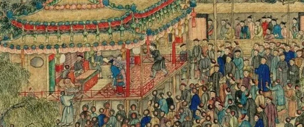 An opera or a play is on at the open-air theatre. The stage is decorated beautifully with lanterns and ribbons. People of all ages are in the audience. Some shorter people stand on chairs to get a good view of the show. The show may be a special celebration in Spring as pink peaches flowers bloom in many parts of the long scroll.