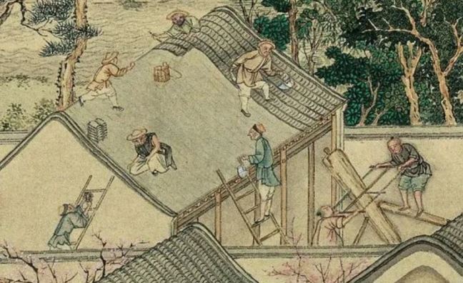 Workmen are laying tiles on the roof tops. Two carpenters are sawing a piece of timber.