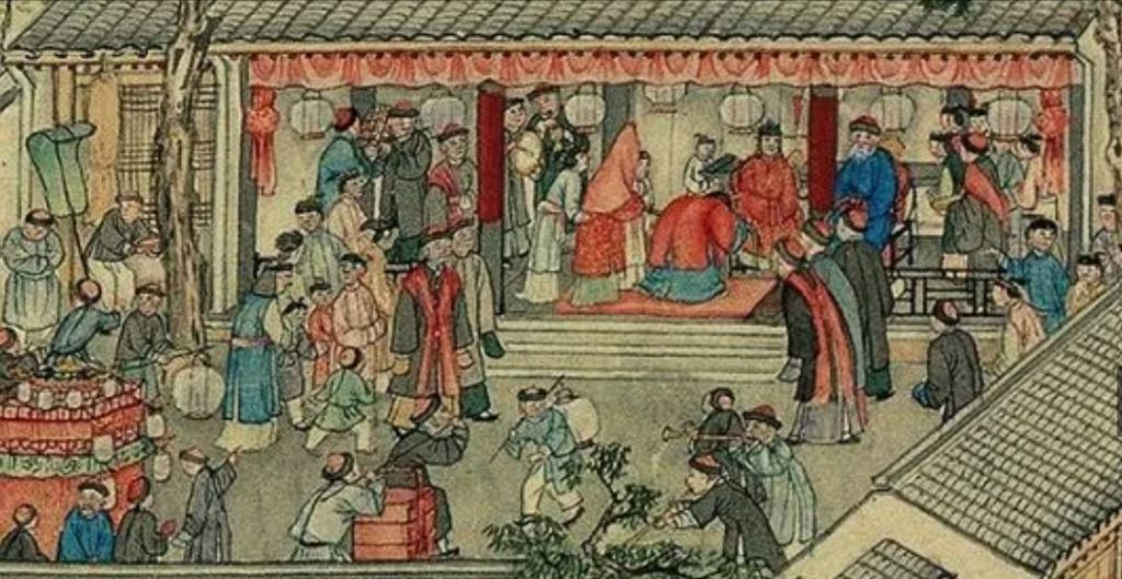 A wedding ceremony is at a grand house with many relatives and guests. The house is decorated with lanterns. We can see musicians at the top left hand corner as well as at the bottom of the painting. There is a bridal sedan chair and two servants carrying gifts in multi-layer boxes. Kids are watching the ceremony with fun.