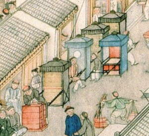 Two porters are carrying a sedan chairFive sedan chairs are waiting for their passengers. Four of them have a blind in front probably made of bamboo matt for the privacy of the passengers. One does not have a blind.A high ranking official riding on horseback