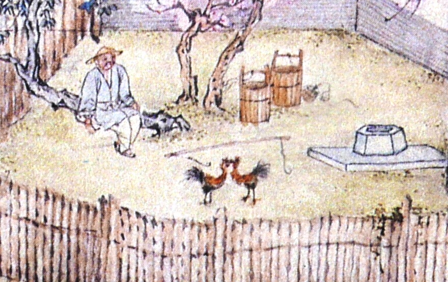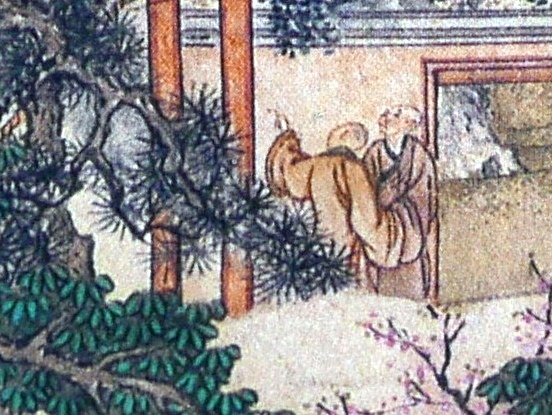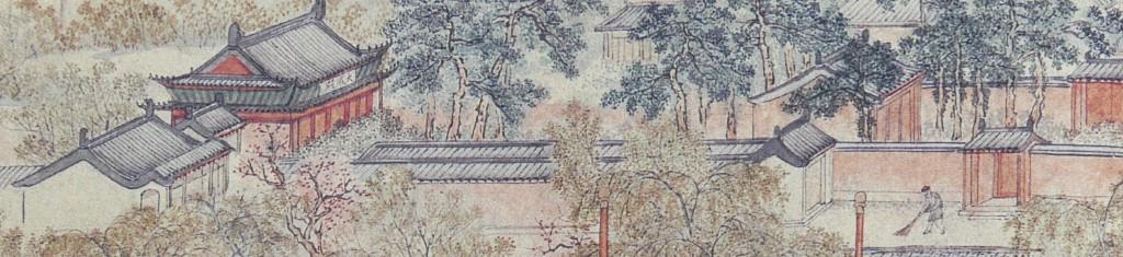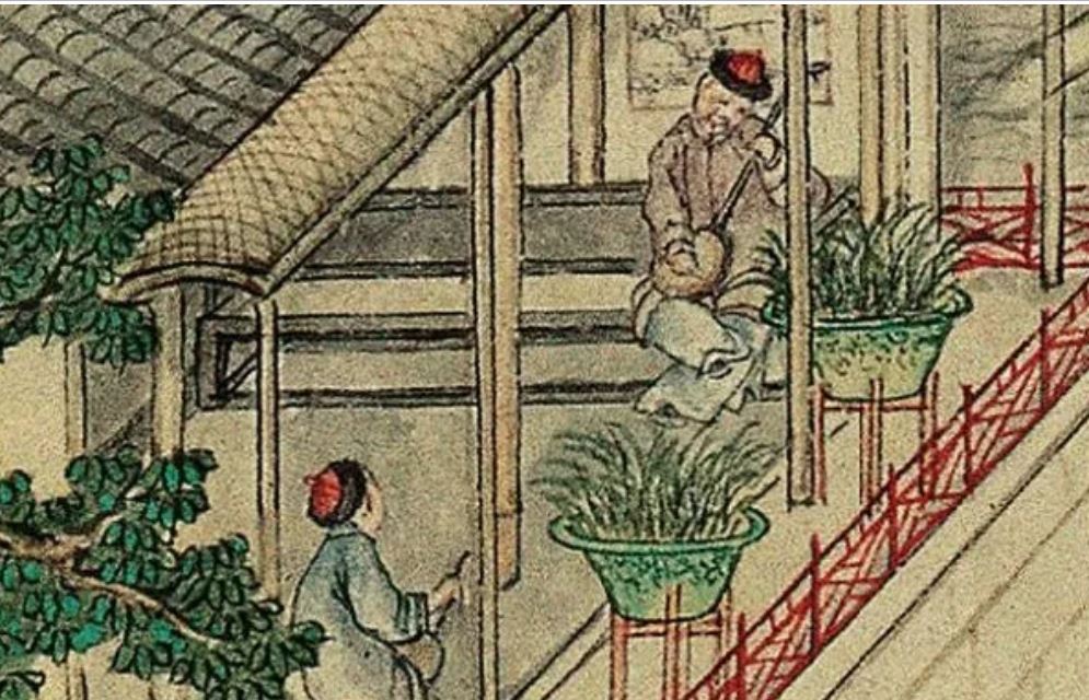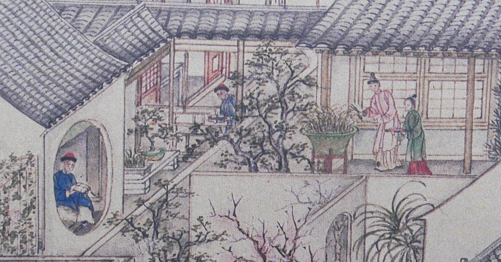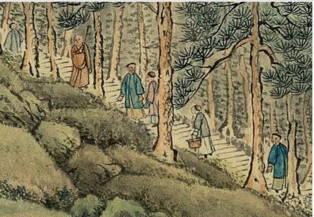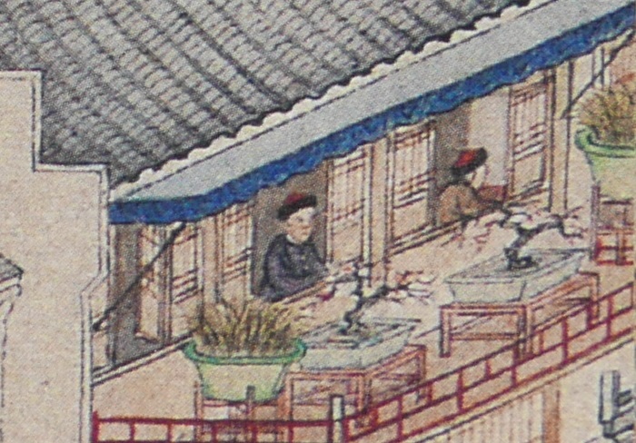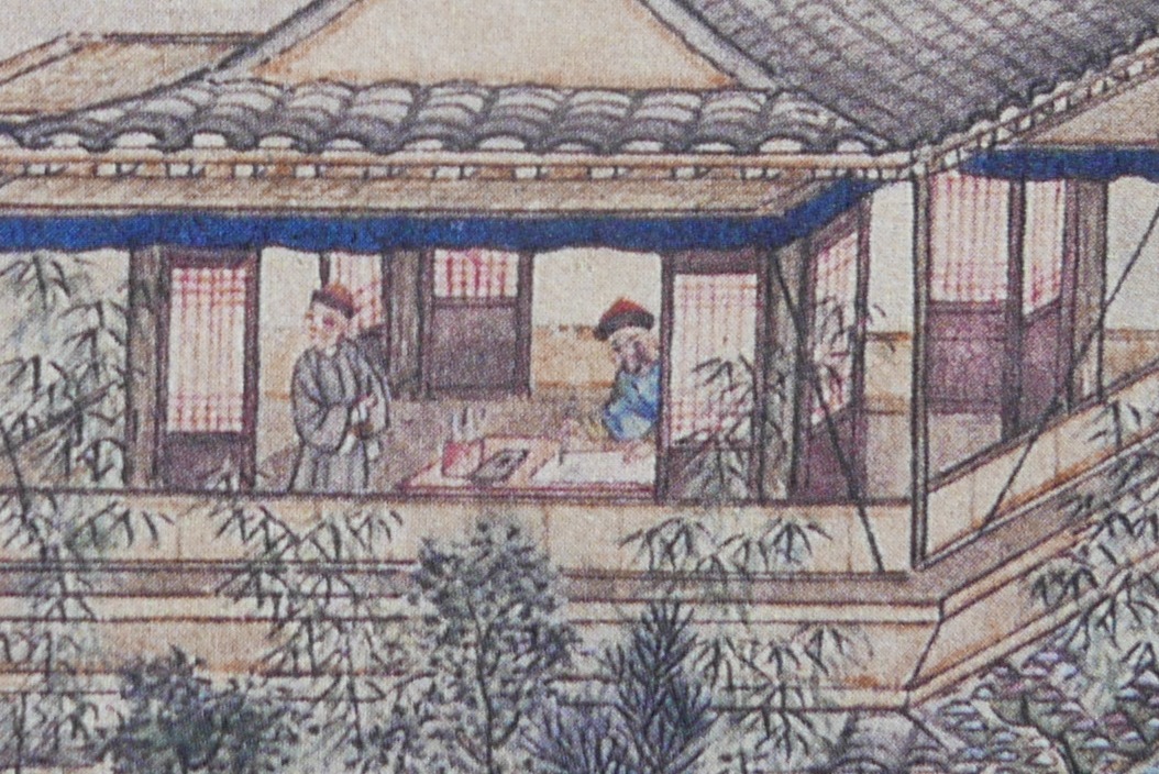 People walk leisurely and chat with each other along a track up the mountain side, with a monk in yellow gown and a rod.Three people are sitting on the rug enjoying a picnic in the countryside. One of them is about to write a poem or do a brush painting on a piece of paper, with an ink stone for making ink by his side. Three servants are serving more food and drinks.A private play is on with a lute accompaniment. Two people in the audience are seated with two standing attendants.Two people facing each other are playing the lute. The two pots of orchids and the landscape painting behind the man depict they are well-educated people. Orchid is a symbol of elegance and friendship.A man is writing calligraphy with a brush on paper in his studio. An attendant is standing beside him.The grandeur Suzhou gardens are famous for the rockery (假山) with stones taken mainly from Tai Hu (太湖). Trees are planted and meticulously trimmed to provide an excellent resort for wealthy people and officials.The woman is pruning a pot of orchid, with a maid on her side. A man on the left is reading a book with a servant bringing him some drink. The garden is full of beautiful bonsai and plants depicting the artistic taste of a wealthy household.Two men with their bonsai and other plants.Three people are chatting leisurely in a garden with bamboo, with a standing attendant.A man is taking a rest under a tree watching two cocks fighting (鬥雞). The two cocks have lost a lot of feathers. Cockfighting is illegal in civilized countries nowadays but in the old days it was common and not regarded as a crime.Bath house (浴堂). The sign says this bath house offers bath with perfume (香水). Patrons have a nice time there.