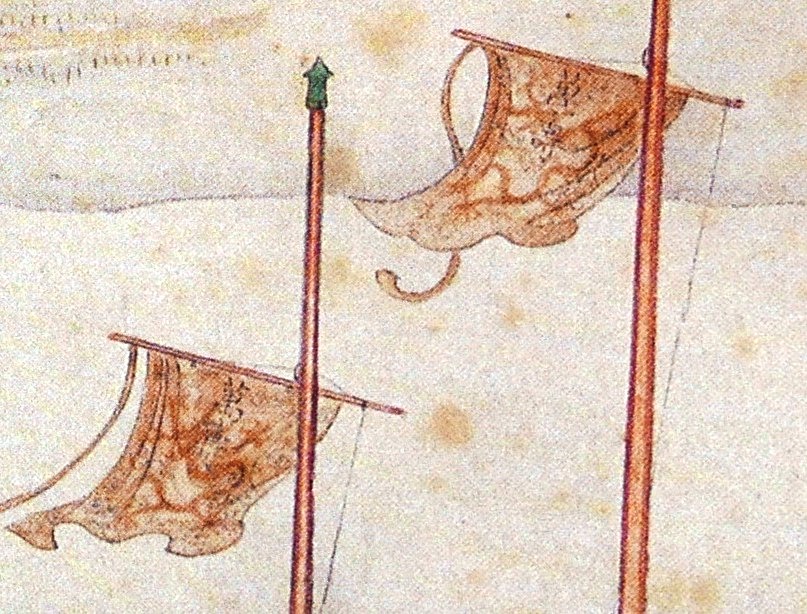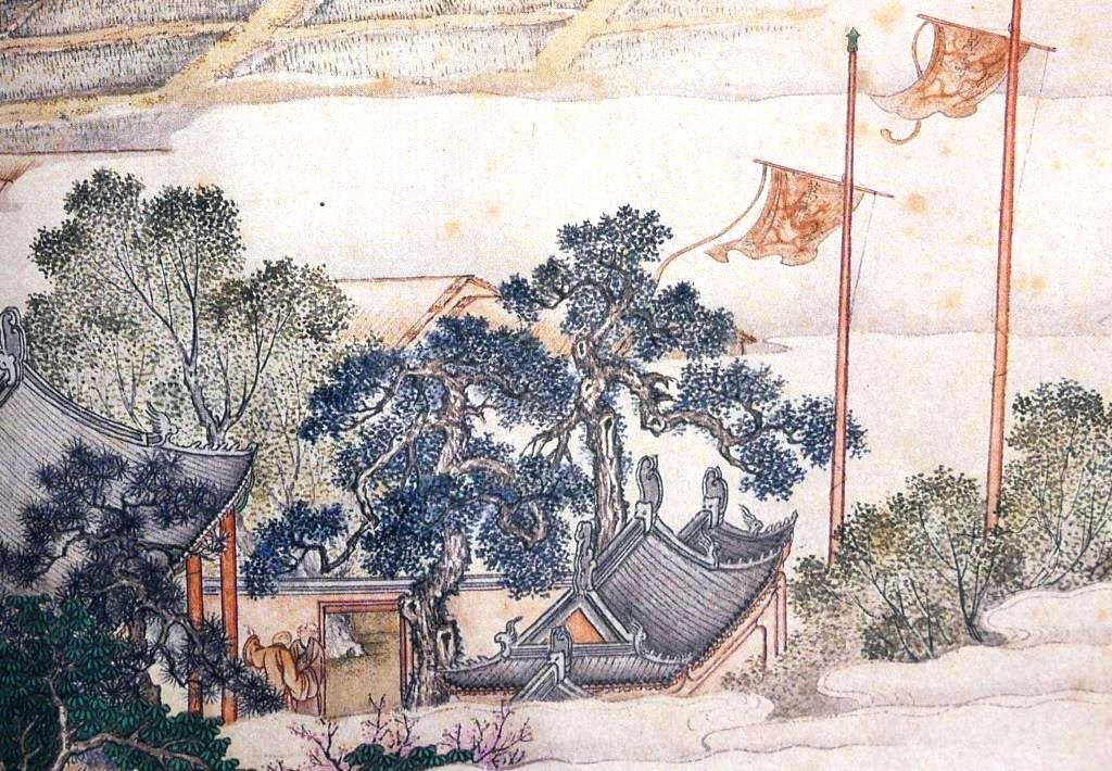 The long scroll starts with two poles with flying orange banners. On the banners are two characters ‘Boundless longevity (萬壽)’ sending well wishes to the Emperor. Green paddy fields are in the distant view. The front view shows two joyful nuns in front of a temple thanking heaven for bringing prosperity and good harvest to the country.The characters ‘Boundless longevity (萬壽)’ on the two orange bannersTwo joyful nuns