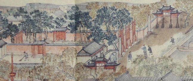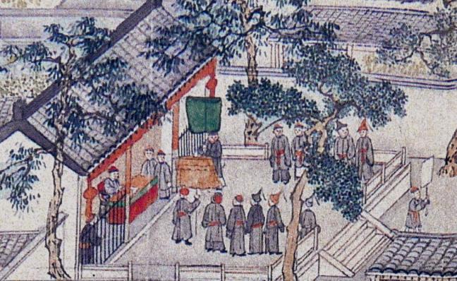 A home school (私塾) with piles of books on the table. A teacher (far left) is talking to his young student.A school with teacher (seated and dressed in blue) and students. The teacher is talking to a student. One of the students is kneeling down on his knees, probably being reprimanded by his teacher. The entrance bears a sign ‘Free School (義學)’, being a school providing free education run by charitable organisations.Tàixué, Imperial College(太學) is the highest level of education offered by the government. It consists of the main building, smaller buildings, a large front yard with paifongs (gateway structures 牌坊). The clouds above the whole campus depicts the college is blessed by heaven.The paifong (gateway structures牌坊) at the front bears the sign ‘Educate talented individuals (育才)’The Main Building with the sign ‘Dacheng Hall (大成殿)’ . Confucian temple usually bears this name. Dacheng means ‘collecting the great achievements of ancient sages (集古聖賢之大成)’.A government public examination is on with a large number of candidates. They are usually in their early twenties. Those who get top results will be allocated to prestigious government posts. This explains why people spend all their energy studying in order to secure a good future.