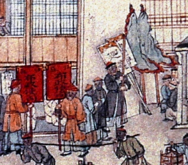 Red colour badges of ‘Chief Administration Commissioner (布政使司)’ and white badges of ‘Avoid (廻避)’, ‘Be Quiet (肅靜)’ alert the public to give way.