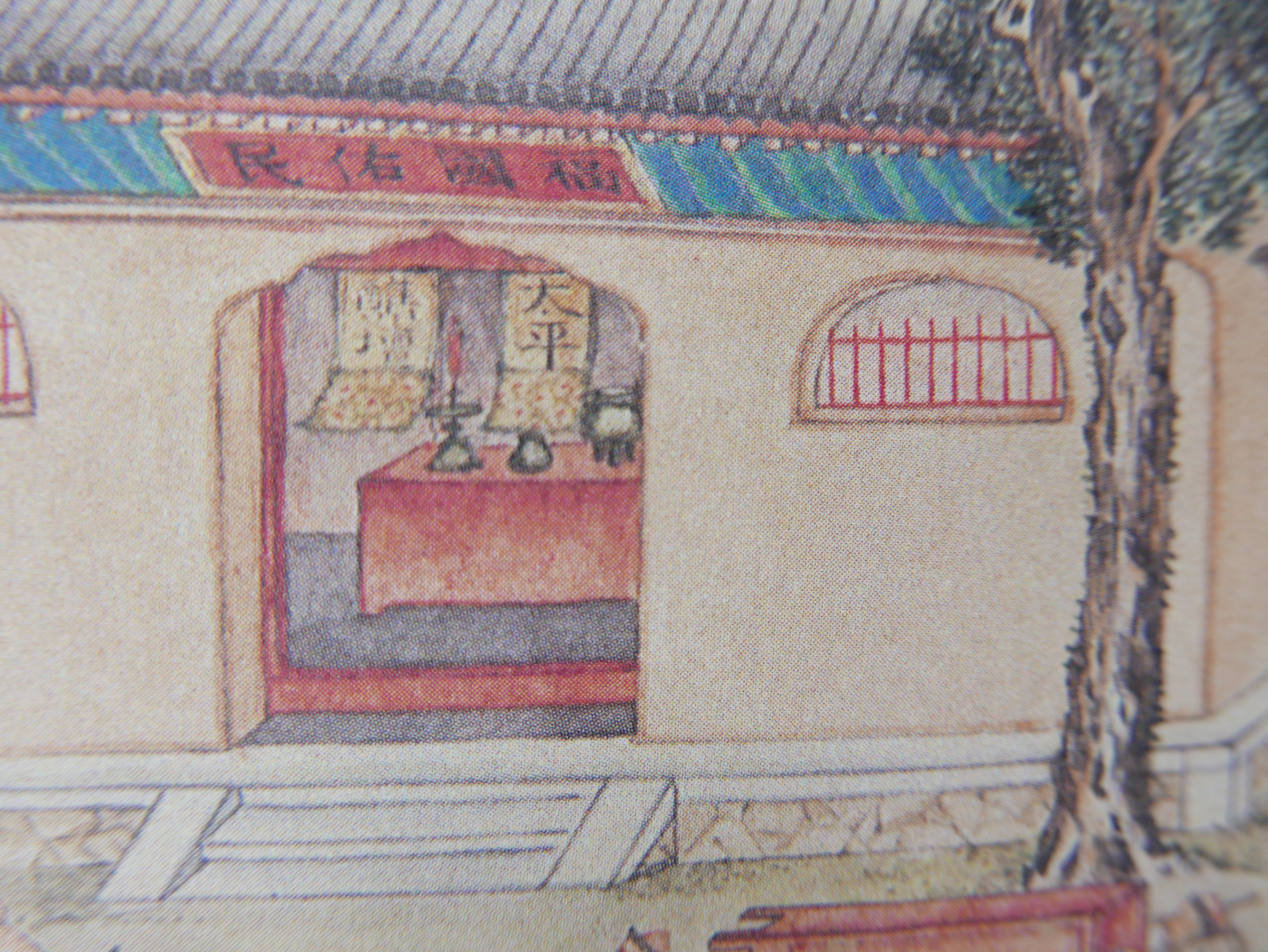 Buddhist temples with smoke and clouds above it depicts the temple has lots of incense and candles burnt and offered, implying good patronage. The trees inside the temples are old pine trees of historical importance.The sign at the door states ‘Bless the country and her people (福國祐民)’This is a monastery with a pergola in the middle of the yard and a statue of Buddha can be seen on the first floor. Two monks are in the building to the left, with two monks or nuns walking in the yard.