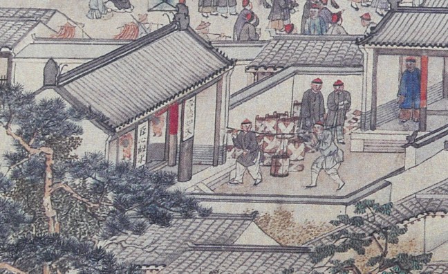Porters are carrying heavy parcels sealed with white strips into the government office. The parcels may be silver or gold to be delivered to the treasury.