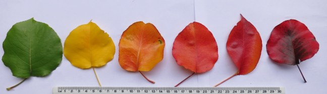 The change of leaf colour from green to yellow , orange and red throughout the season
