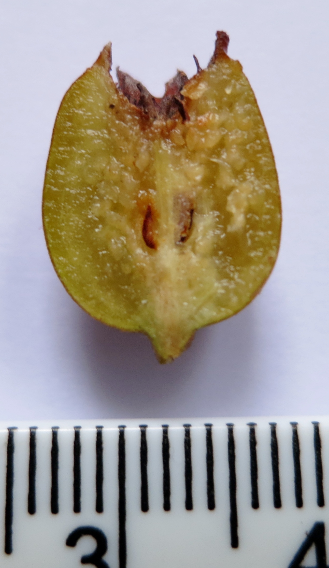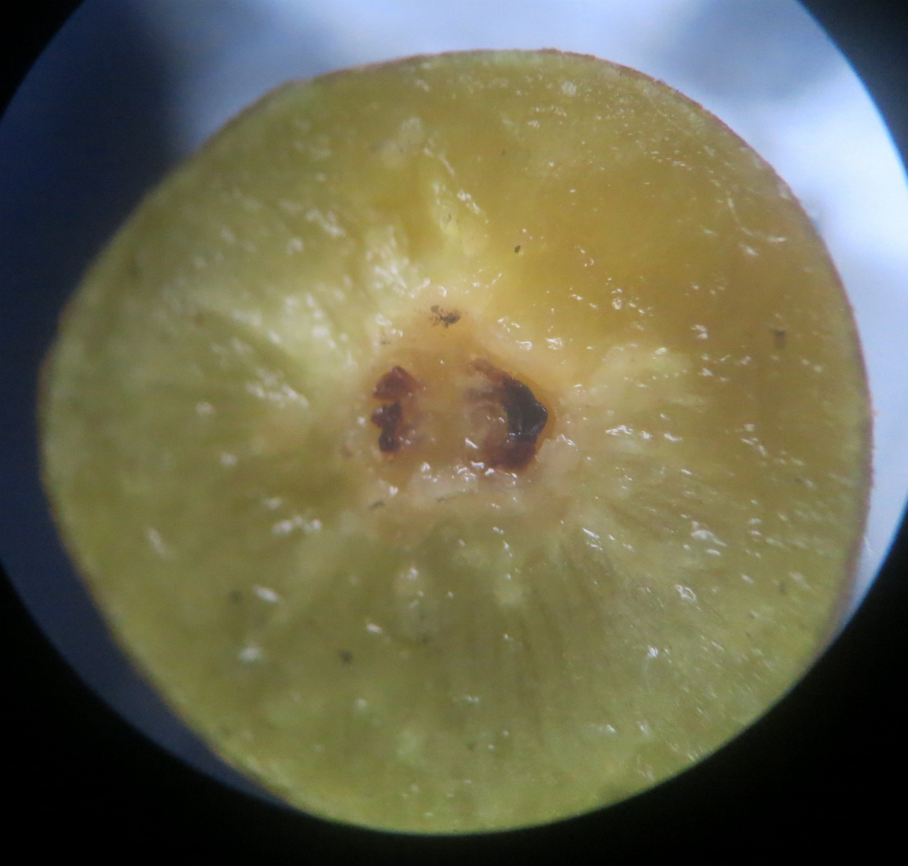 The close-up image of the tiny pear fruit. As the fruit is below the sepals, the ovary is inferior to the sepals.