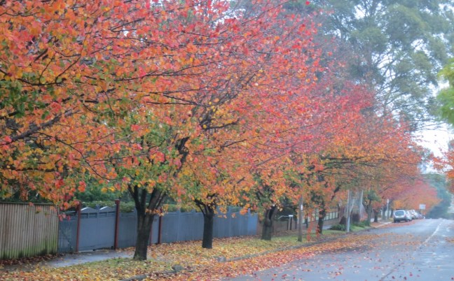 The leaves of the trees have turned yellow, orange and red and they start to fall off from the branches. The photo was taken in Chatswood, Sydney on 13 June 2017 (winter time).