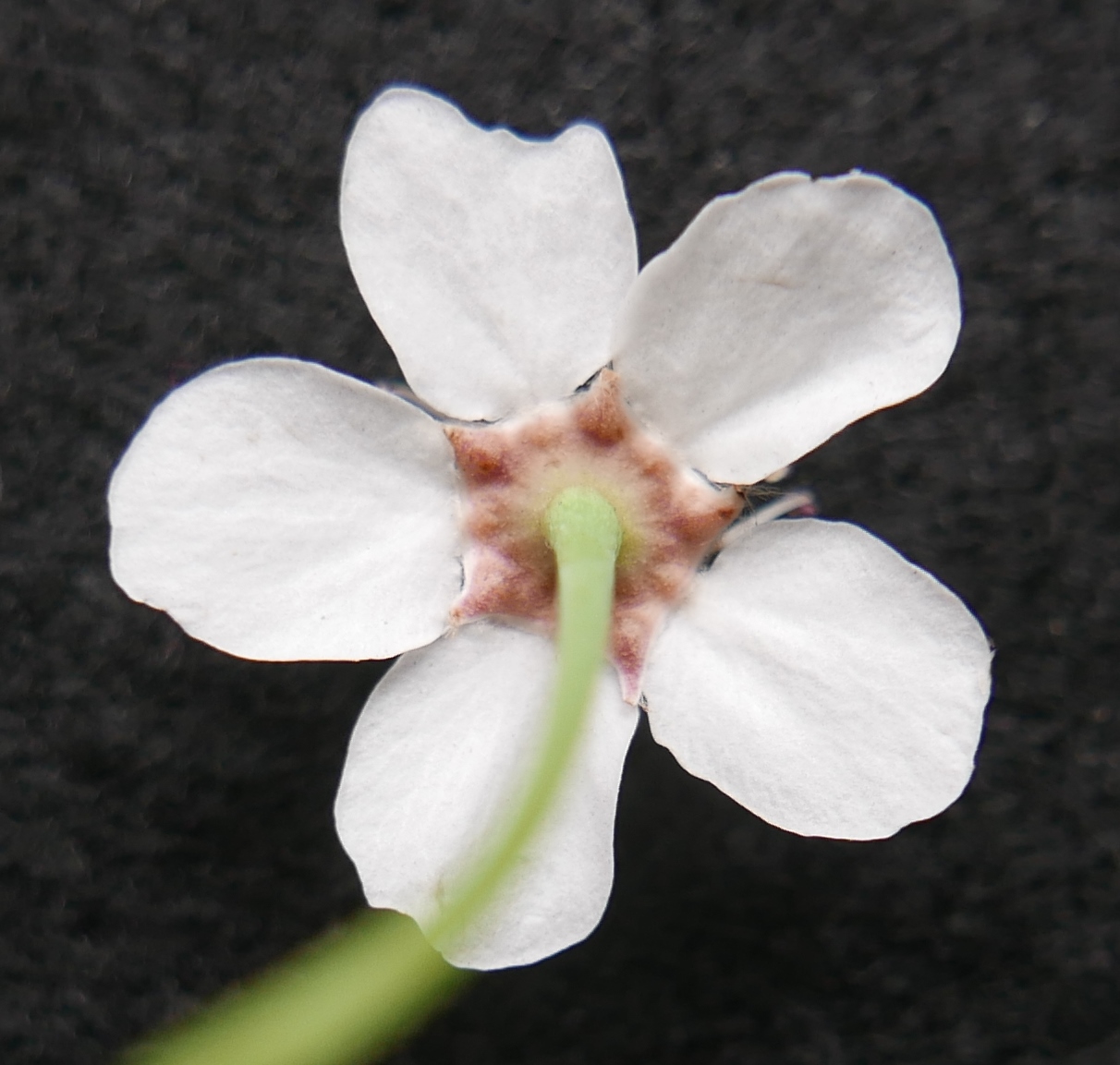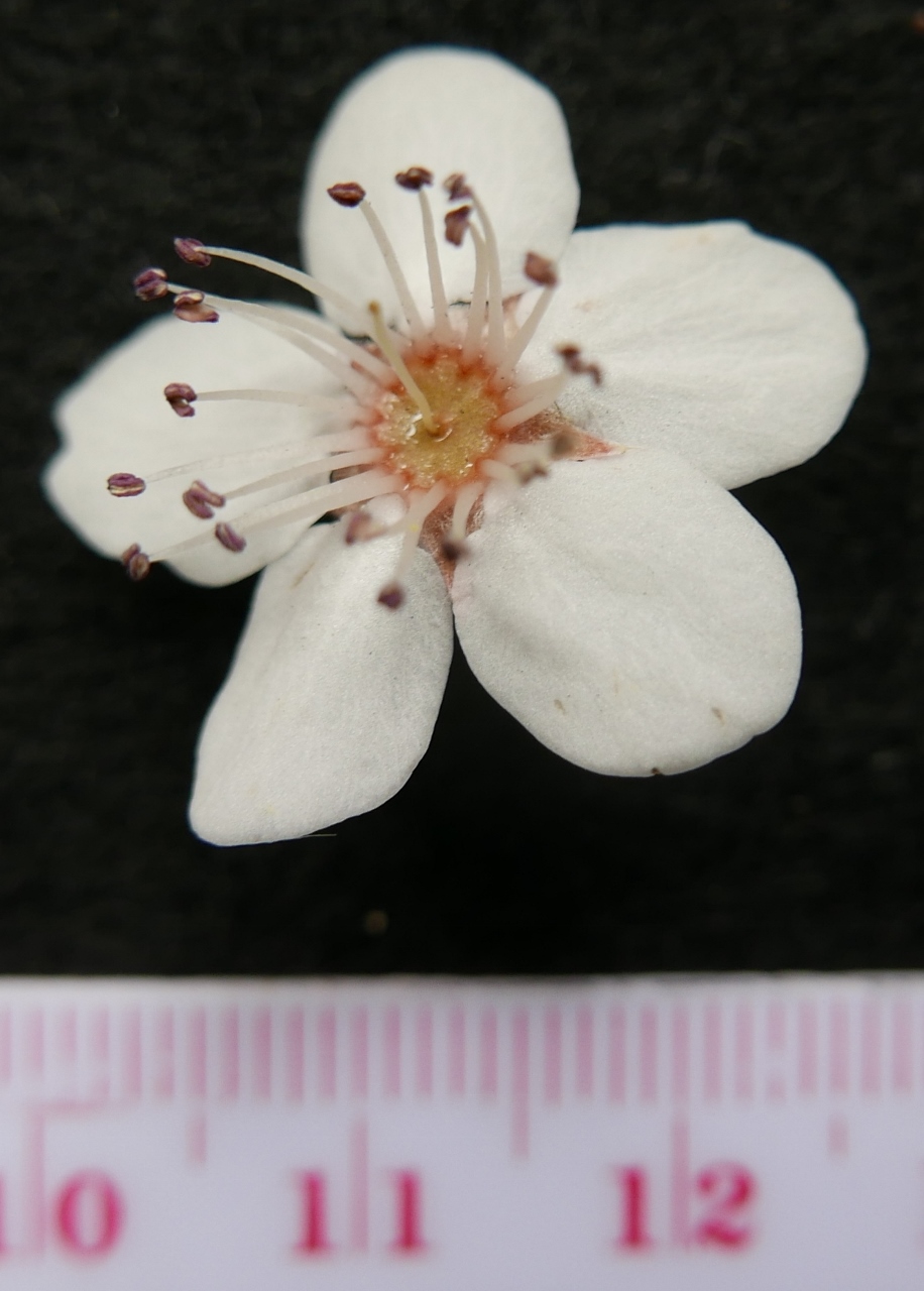 The flowers with long pedicles are in clustersThe flower has 5 white petals, many stamens and one pistil at the centre.The back of the flowers shows 5 fused pink-colour sepals