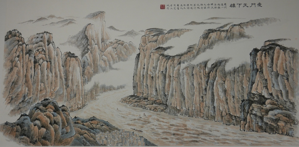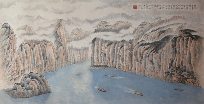 Qutang Gorge before the building of the Dam, (2013), 68 x 136 cm , ink and water colour on paper 夔門通一線,怪石插橫流。峰與天關接,舟中地窟行。(清 何明禮詩) Qutang Gorge after the building of the Dam, (2013), 68 x 136 cm , ink and water colour on paper With Qutang Gorge in the background of the photo Patrick on a cruise up the Yangtze River in 2013 Share this: Click to share on X (Opens in new window) X Click to share on Facebook (Opens in new window) Facebook Like Loading...