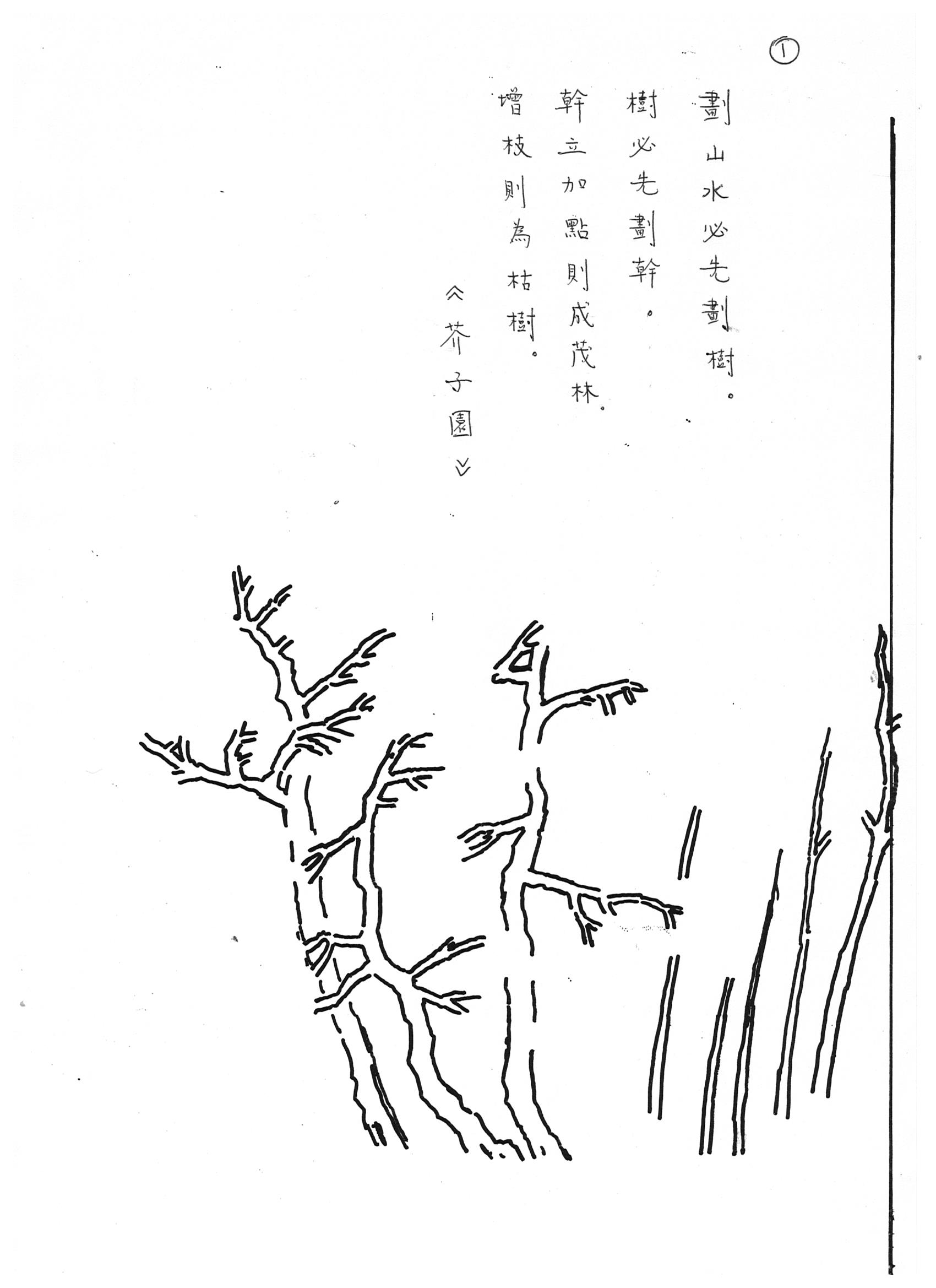 Stage 1 – We usually start the painting by drawing the trees in the foreground. The tree trunks are outlined first. More branches are added onto the trees. I always recommend my students to use very pale grey ink to sketch the outline. The pale ink is made by diluting the black ink with a lot of water on a palate. After the sketching has been finalised, darker and firmer lines can be drawn onto the pale lines.