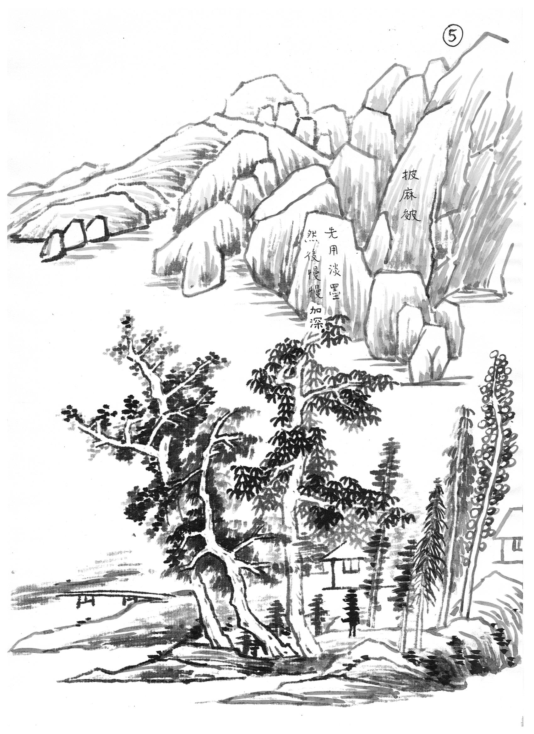 - Rubbing / smudging (擦) : add some dry and pale rough lines to smudge with the ts’un strokes. This can help to merge the strokes together.