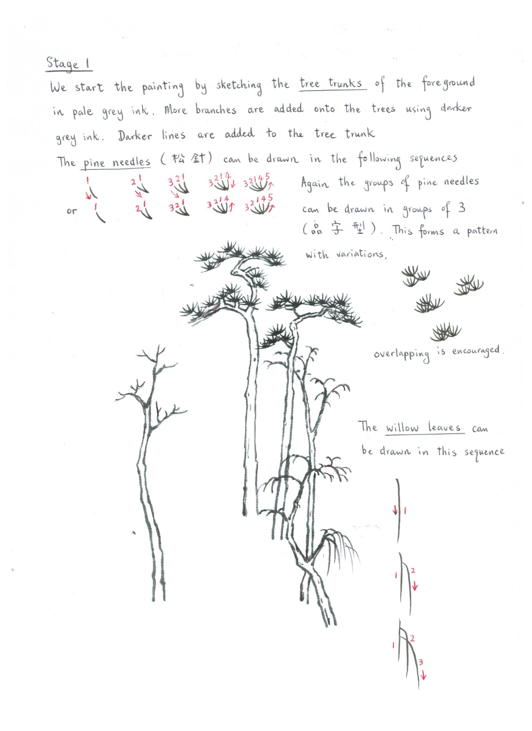 The pine needles (松針) are drawn in group of 5 tiny strokes with the ends converging to a single point at the bottom. Then more groups of 5 tiny strokes are drawn and each group can touch and coincide partially with one another to form the foliage of the pine tree.