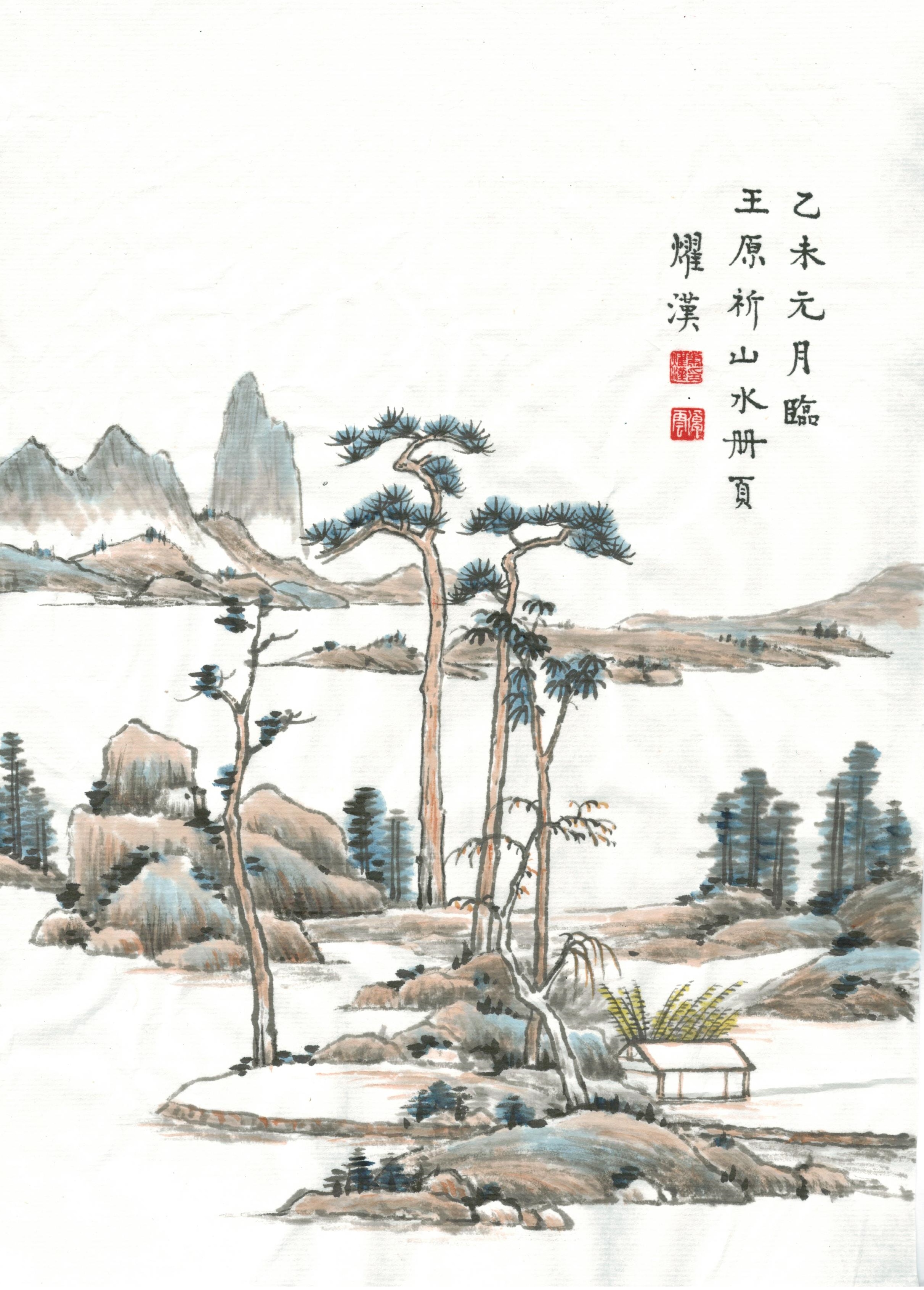 The finished work with the inscription of the date (in the First Lunar Month of 2015 乙未元月) , this is a copy of Wang Yuanqi landscape album leaf, my name 蕭燿漢 and 2 small red seals of my name and my alias 倬雲.