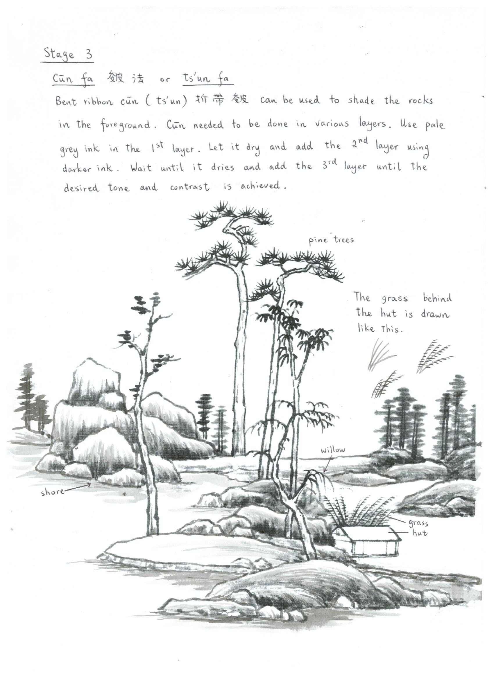 The rocks are shaded with bent ribbon ts’un (cūn)(texture strokes) 折帶皴. The ts’un needed to be done in several layers. Use pale grey ink in the 1st layer. Let it dry and add the 2nd layer. Darker grey ink may be used in the 2nd layer. Wait until it dries, add the 3rd layer and so on until the desired tone is achieved. Sometimes subsequent layers can be added before the previous layer has dried. Then the layers can blended well with one another. Artists are strongly recommended to explore other ways for doing the ts’un.