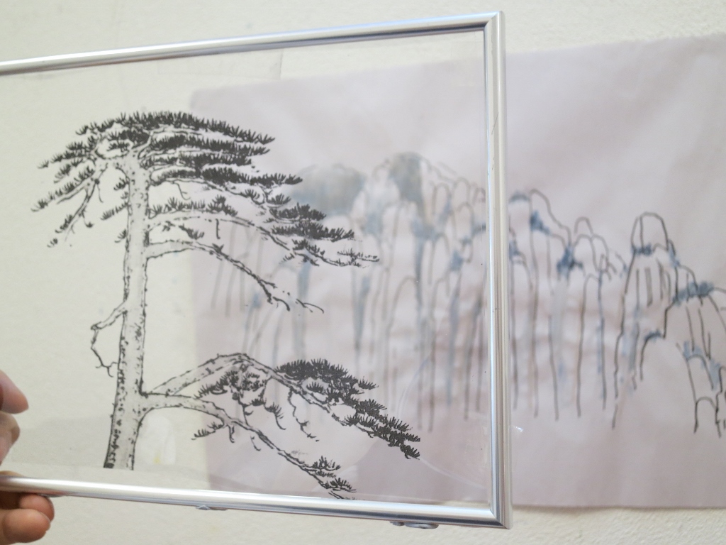 The peaks of Huang Shan are drawn onto a piece of paper.