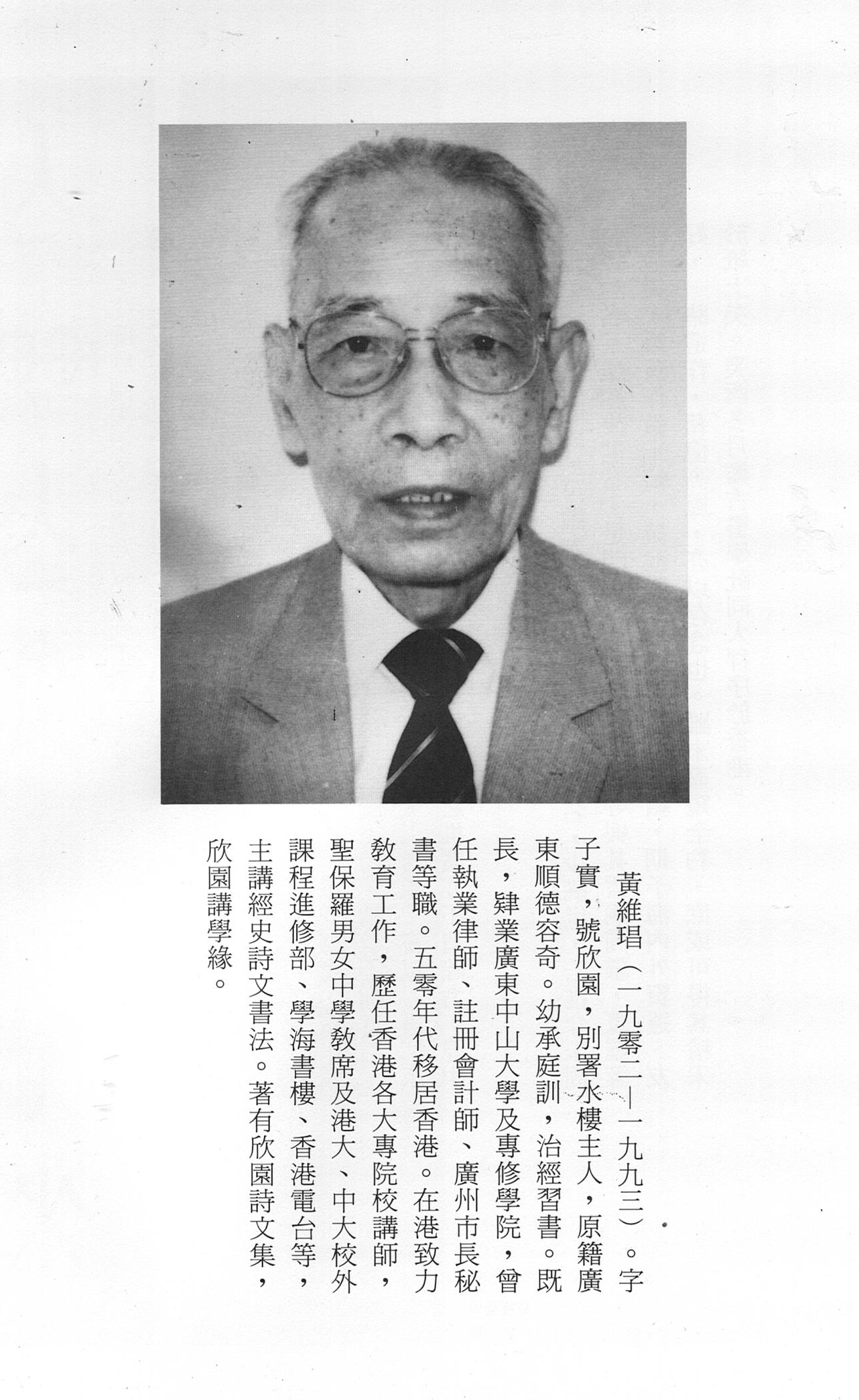 Professor WONG Wai Cheong (1902 – 1993) was a well-known Chinese literature scholar and Calligrapher. Coming from a highly educated family in Shun De (順德), Guang Dong (廣東), Professor Wong graduated from Guangzhou Zhongshan University (中山大學) with double degrees. He was both a lawyer and a certified accountant and he held senior positions in the Guangzhou government. Professor Wong migrated to Hong Kong around the 1950s and taught at various secondary and tertiary education institutions. His contributions to Chinese education were significant. He had publications of his own poems and lecture notes.