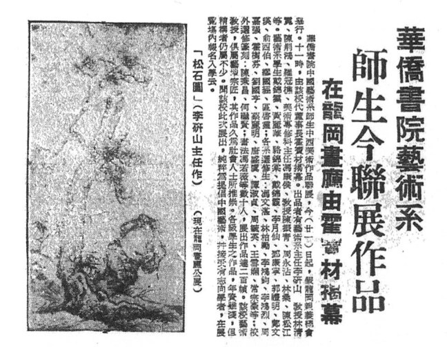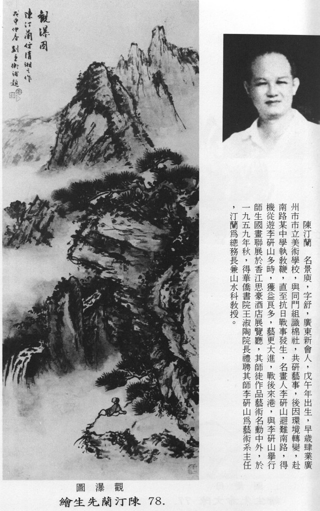 In 1959 Li Yanshan was hired as the Head of Fine Art Department (藝術系主任) of Wah Kiu College (Hua Qiao Shu Yuan 華僑書院) and Chen was also hired as Head of General Affairs and the Professor of Shanshui Painting (山水科教授).