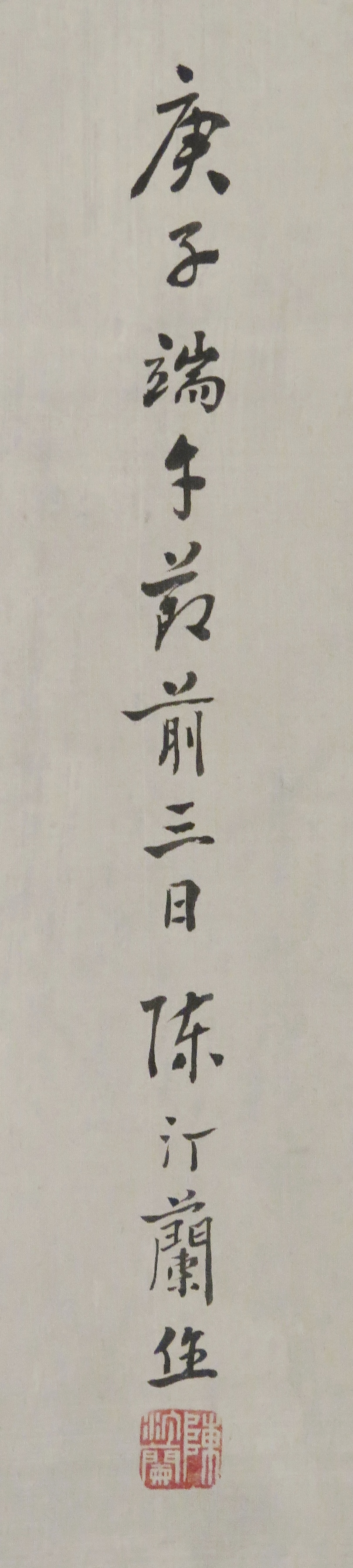 Chen seldom signed his paintings but this painting is an exception. The inscription on the painting was written by Chen himself. 庚子 (1960) 端午前三日 陳汀蘭作. This is very rare and precious.