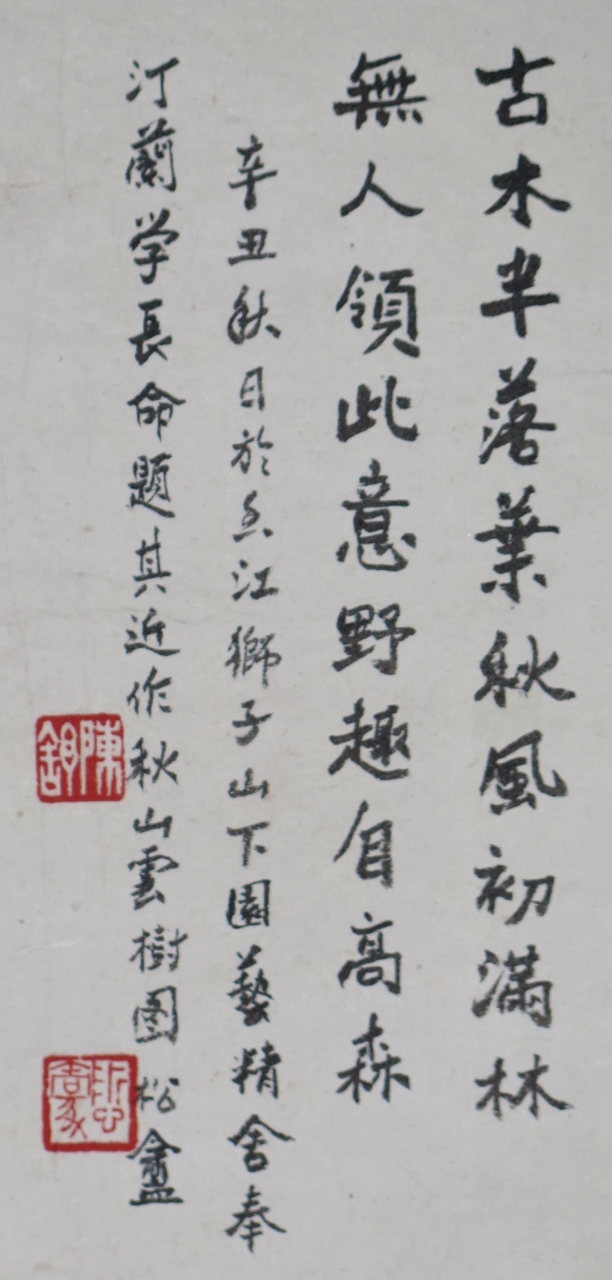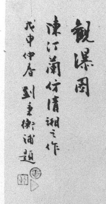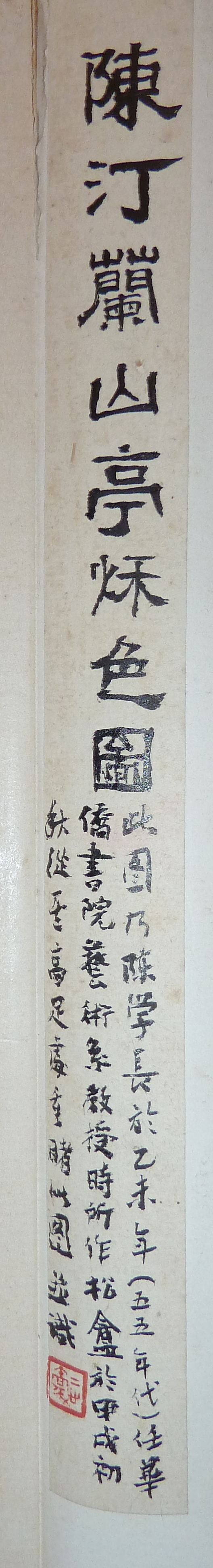陳汀蘭山亭秋色圖 此圖乃陳學長於乙未年 (五五年代) 任華僑書院藝術系教授時所作。松盫於甲戍 (1994) 初秋從其高足處重睹此圖並識。印章: 哲豪 (朱文方印)