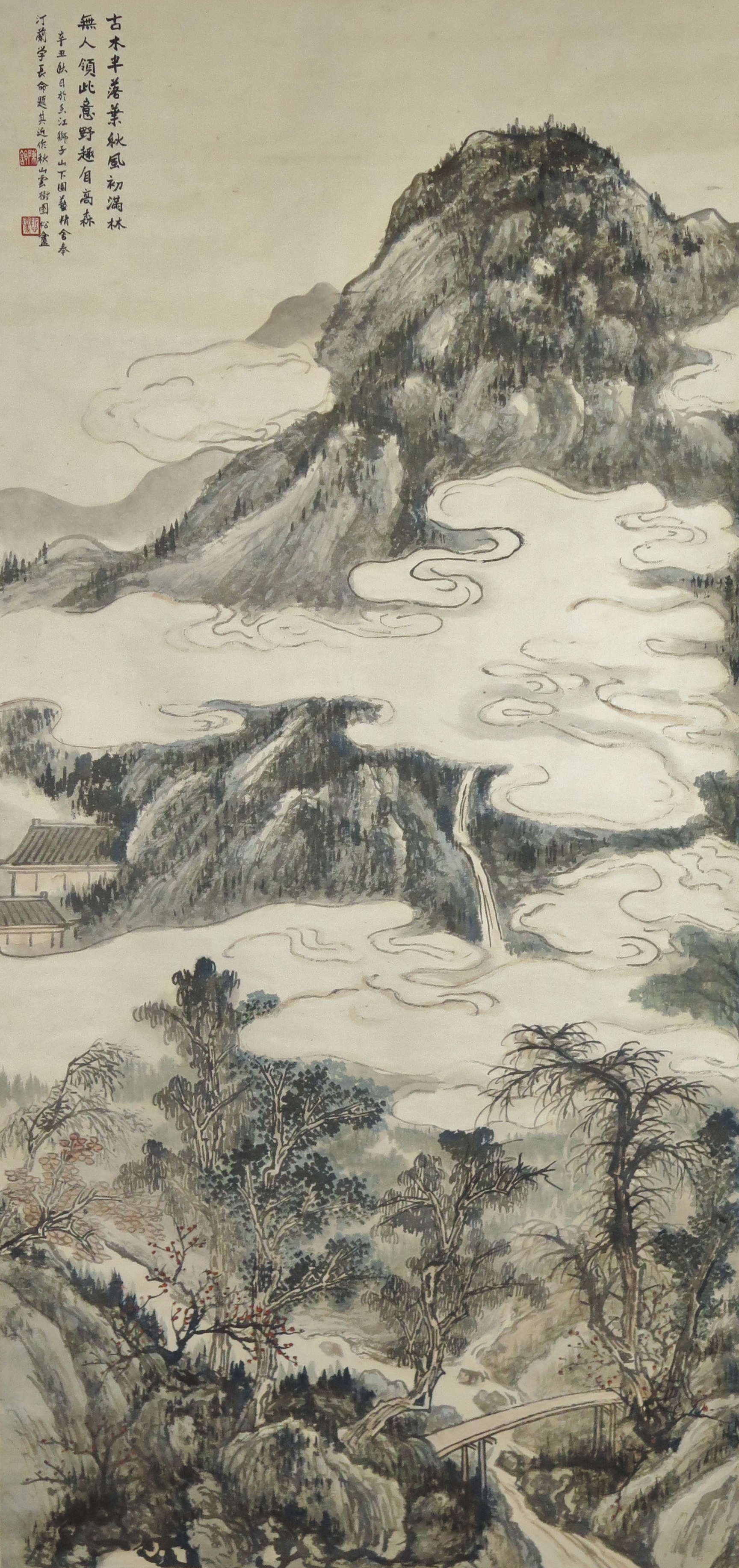 Ip Chit Hoo was a very close friend of Chen. Chen visited Ip’s studio at St Louis School, Hong Kong from time to time in the 1950s. Chen told Ip that on an autumn day in 1960 (庚子年) he showed Li Yanshen his painting Misty Mountains (雲山煙雨圖), Li was overwhelmed with joy and extremely pleased with his most beloved student. Unfortunately at that time the painting on silk had not been mounted as a handscroll or else Li Yanshen would have written a colophon for the painting. But Li immediately executed a landscape painting on a piece of paper for Chen to show his joy and appreciation. The painting was named Hermit in a Mountain with Streams (溪山高隱). Both the painting and the inscription in cursive script show rich and unpretentious brush-strokes of extremely high skill and expertise. This is indeed one of the very best late works of Li before he passed away in 1961.