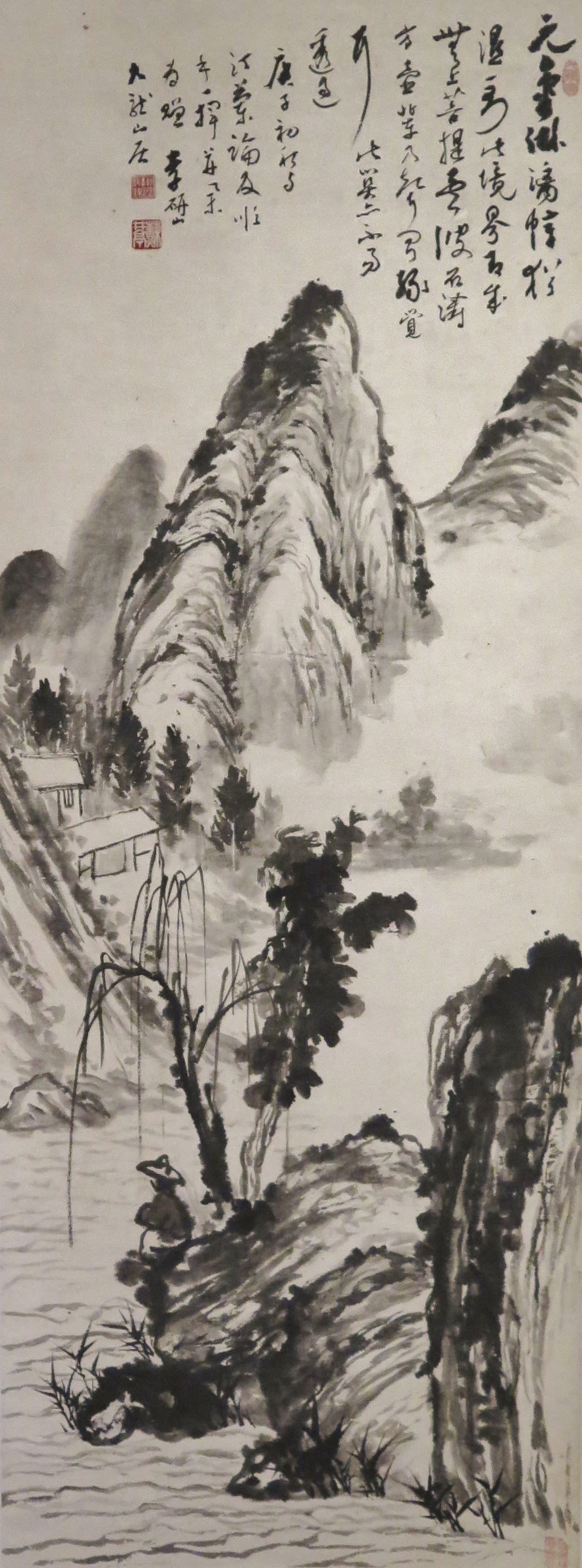 Inscriptions: 元氣淋漓障猶濕,到此境界即成無上菩提。蓋彼石濤方壺輩乃聲聞緣覺耳。此關亦不易透過。庚子初秋與汀蘭論及順手一揮, 並舉為贈。李研山九龍山居。印章: 九龍山居 (朱文橢圓印), 新會李居端鉨 (白文方印), 蘇井亭 (白文方印).