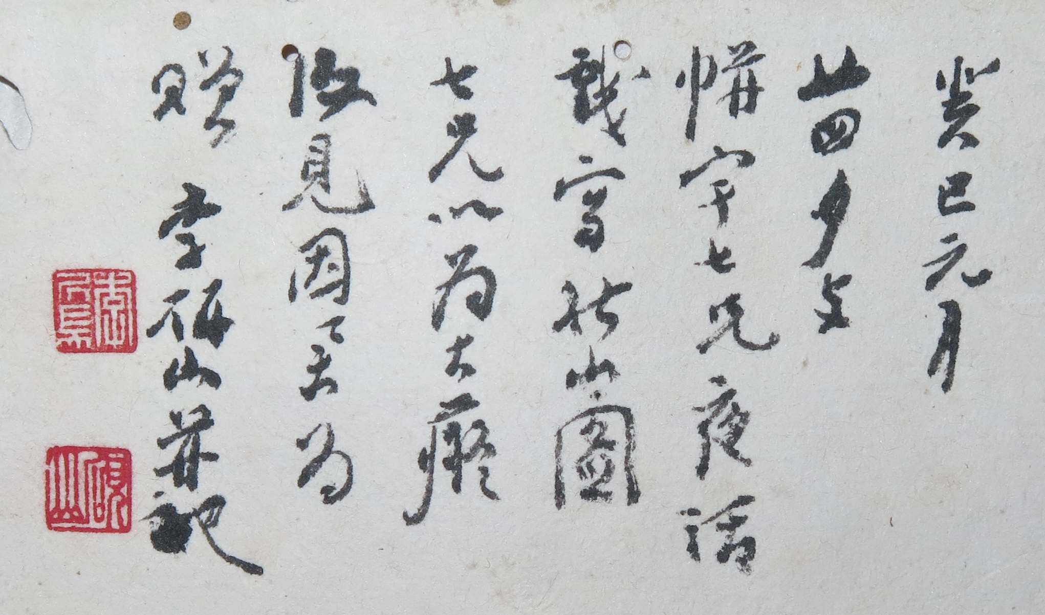 釋文: 癸巳 (1953) 元月廿四夕與帡宇七兄夜話戲寫秋山圖。七兄以為大癡復見,因舉為贈。李研山并記。印章: 李居端 (白文方印),硯山 (朱文方印)