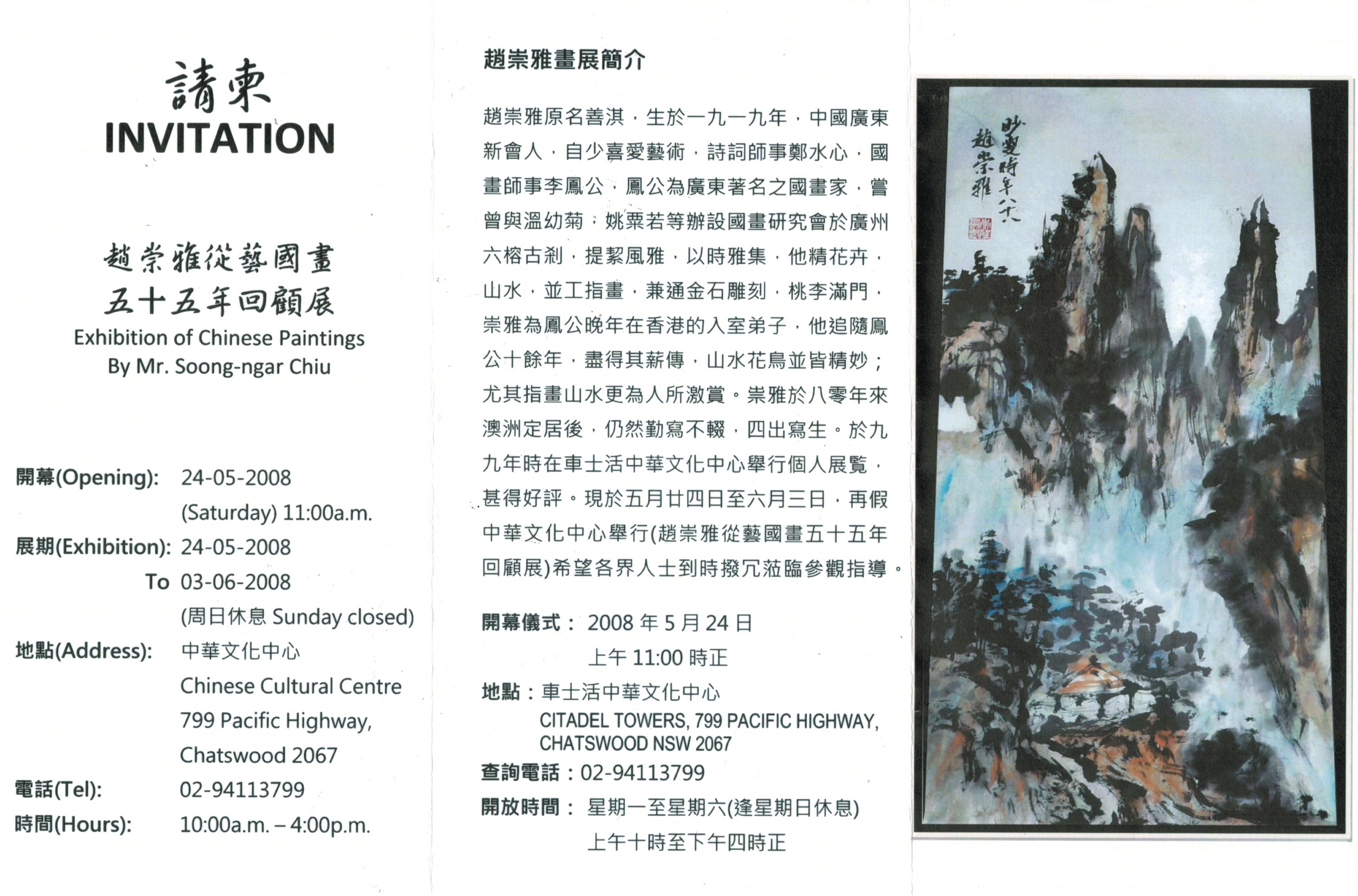Mr Chiu made great contributions in promoting Chinese painting in Sydney. My teacher, Mr Ip Chit-hoo (葉哲豪老師), was also a student of Mr Li. Mr Chiu was most kindly in giving me encouragement and advice about Chinese landscape painting.