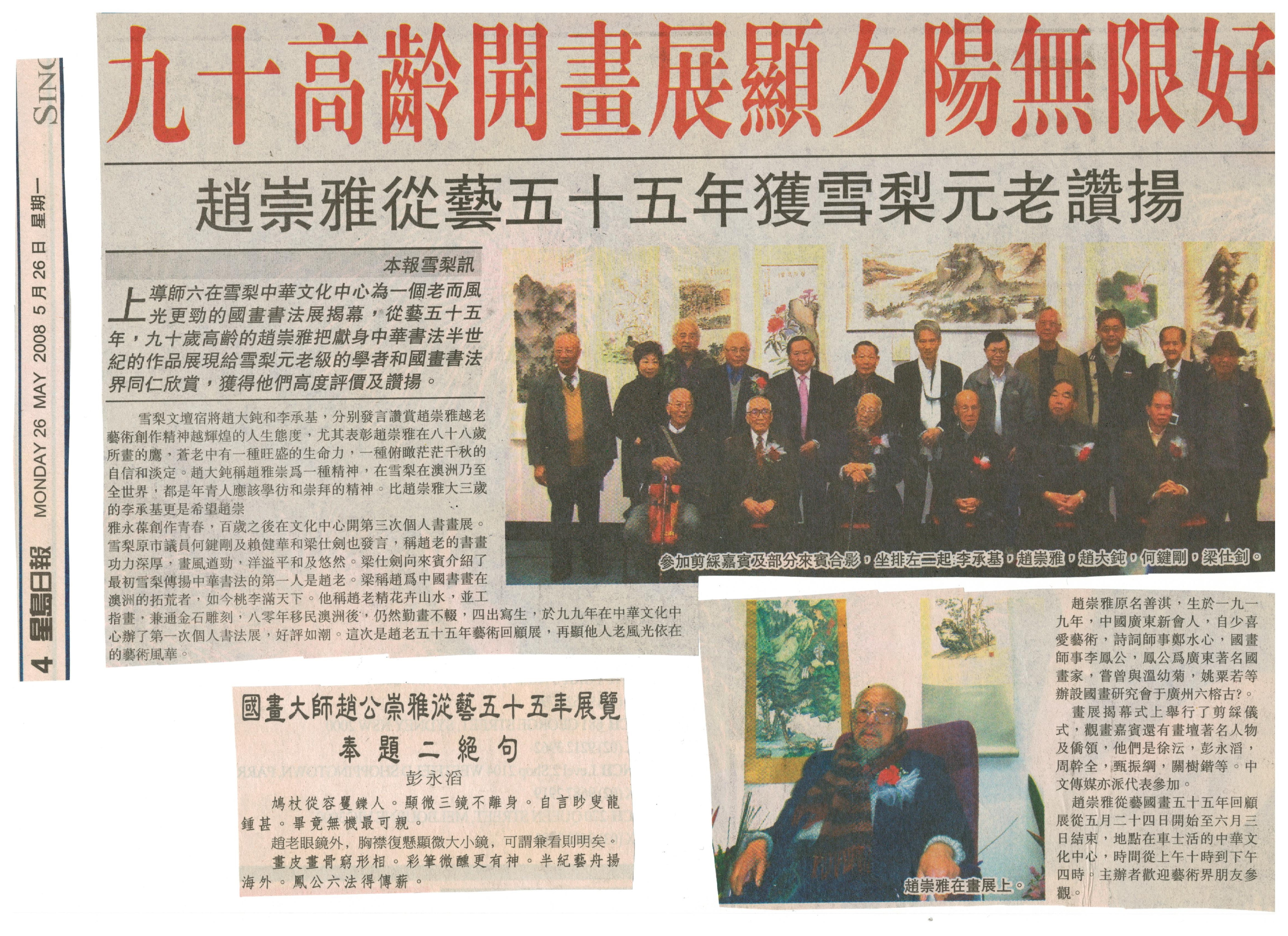 星島聯網‧澳洲版 社區: 九十高齡開畫展顯夕陽無限好 趙崇雅從藝五十五年獲雪梨元老讚揚 26 May 2008 / 09:30 a.m.