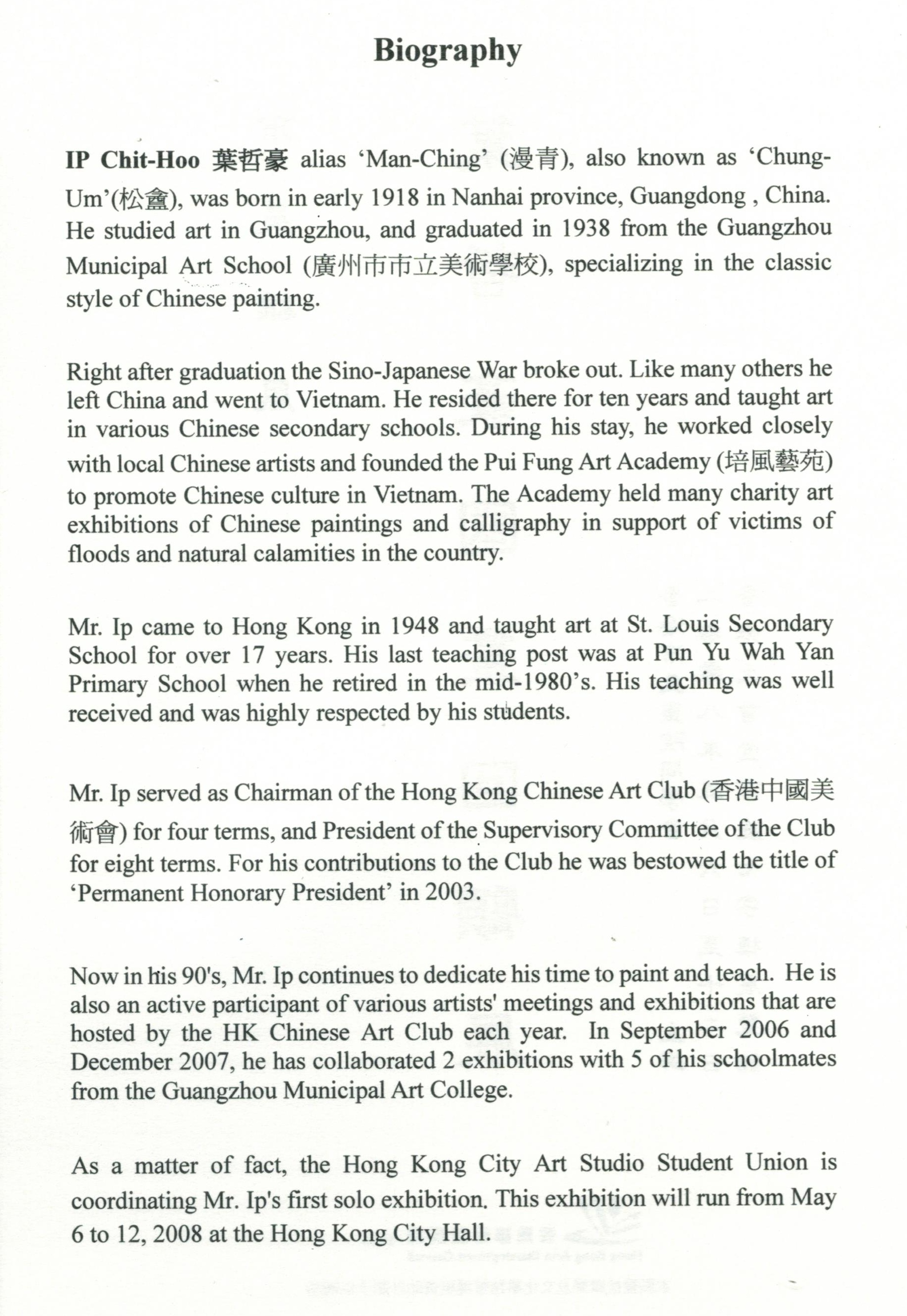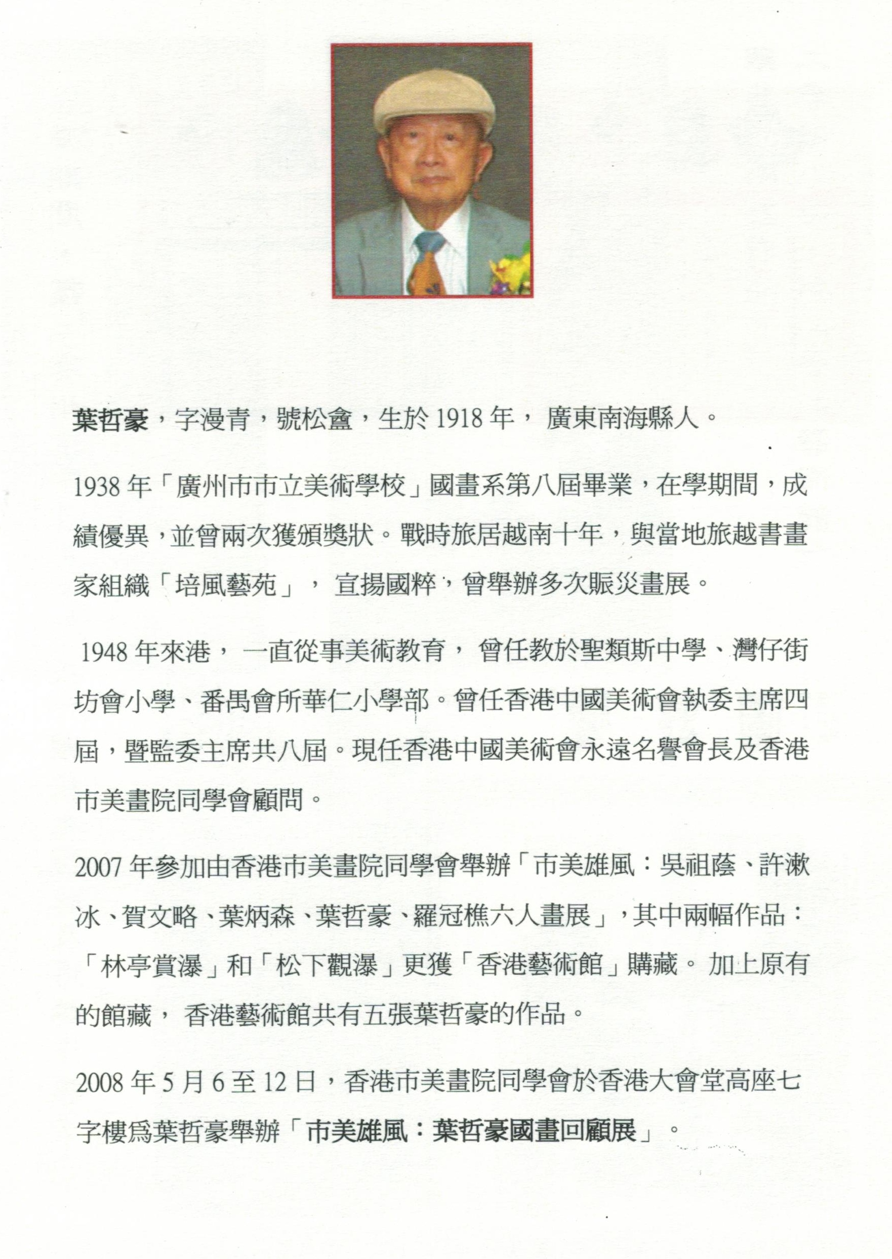 I wish to thank Miss Maria Yip for her continued guidance and support and her kind permission to include on this website the images of Mr Ip’s paintings as printed in his retrospective exhibition catalogue 葉哲豪國畫回顧展 (2008).