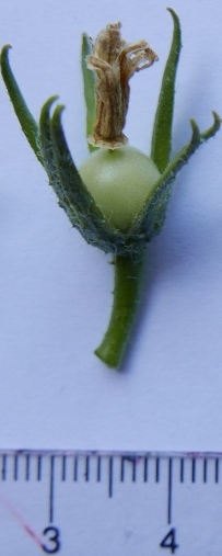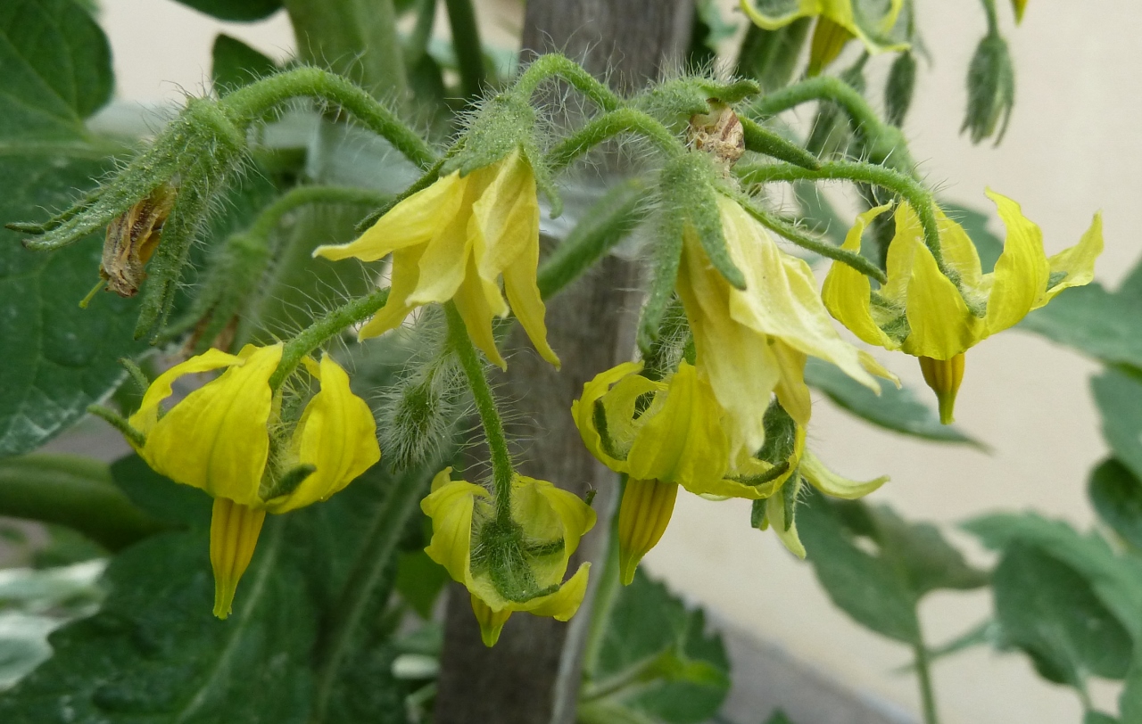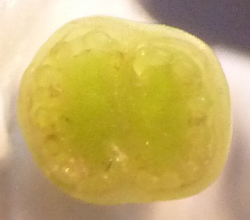 In this domestic variety of tomato, the anther is shaped like a hollow tube, with the pollen produced within the structure, rather than on the surface. The pistil lies within the anther, which facilitates self-pollination. In the wild type, the pistil protrudes out of the syngenesious stamen promoting cross-pollination.