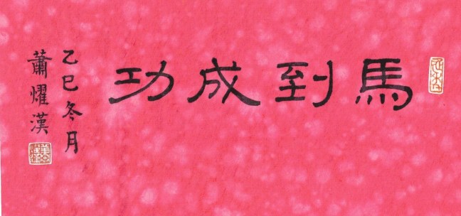 馬到成功 (隸書 clerical script), inscriptions: 乙巳冬月 蕭燿漢, ink on pink tiger-skin xuan paper 粉紅色虎皮宣紙, long red seal: 延年increase longevity, square white seal: 蕭燿漢, 10 x 20 cm