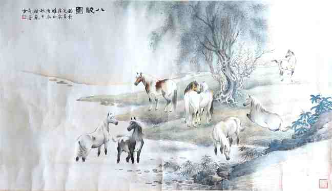 Ma Nai Liang (馬廼良) Galloping horses 逸驥尋雲步步高, dated 2004, ink on paper, around 136 x 222 cm (Mr Ma only used pure ink in this masterpiece. He diluted the ink to many different shades of grey. This monochromatic palette naturally focuses the viewer’s attention on texture, form, and composition rather than the distraction of colours. Mr Ma is a famous and well-respected artist, calligrapher and fine art teacher and educator in Sydney. He came from Hong Kong and he has been living in Australia for 34 years.)
